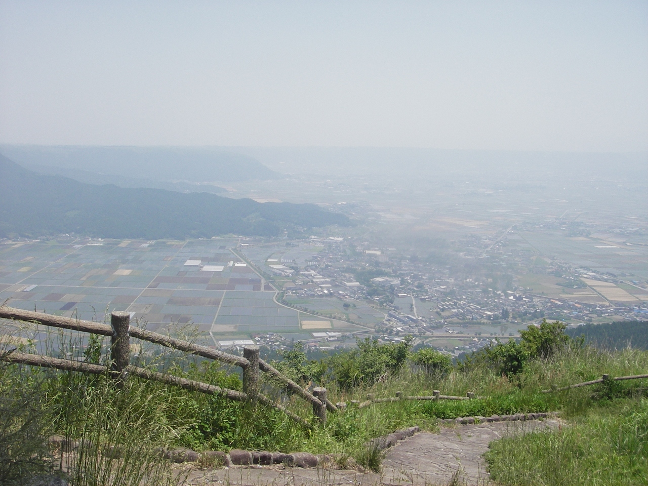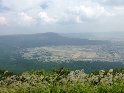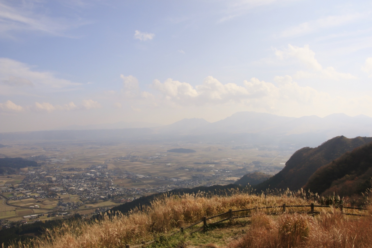 ミルクロード沿いのスカイスポーツのポイント。田園が広がる阿蘇谷と米塚、阿蘇五岳を一望できる。