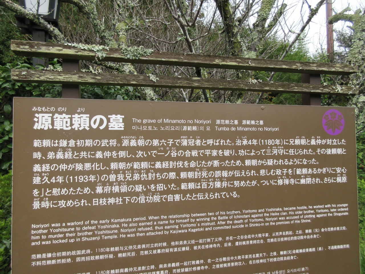 同じ源氏といっても源頼朝や義経に比べるとちょっとマイナーですが、頼朝の弟で義経の兄、源範頼の墓が伊豆の修善寺にありました。... 続きを読む修善寺の観光の中心「とっこの湯」から15分ほど歩いた山沿いで、墓というかちょっとした祠のようになってました。土台がコンクリートになっていたのは、土が流れるのを防ぐためですかねえ。源範頼は木曽義仲を倒し、一ノ谷の合戦で平家を破るなど、義経と並び平家を滅亡に追い込みました。ところが、頼朝に疑われて修善寺に幽閉され1193年、梶原景時に攻められて自害しました。義経といい、頼頼といい、源氏ってどうしてこう兄弟が殺し合ったんでしょうね。