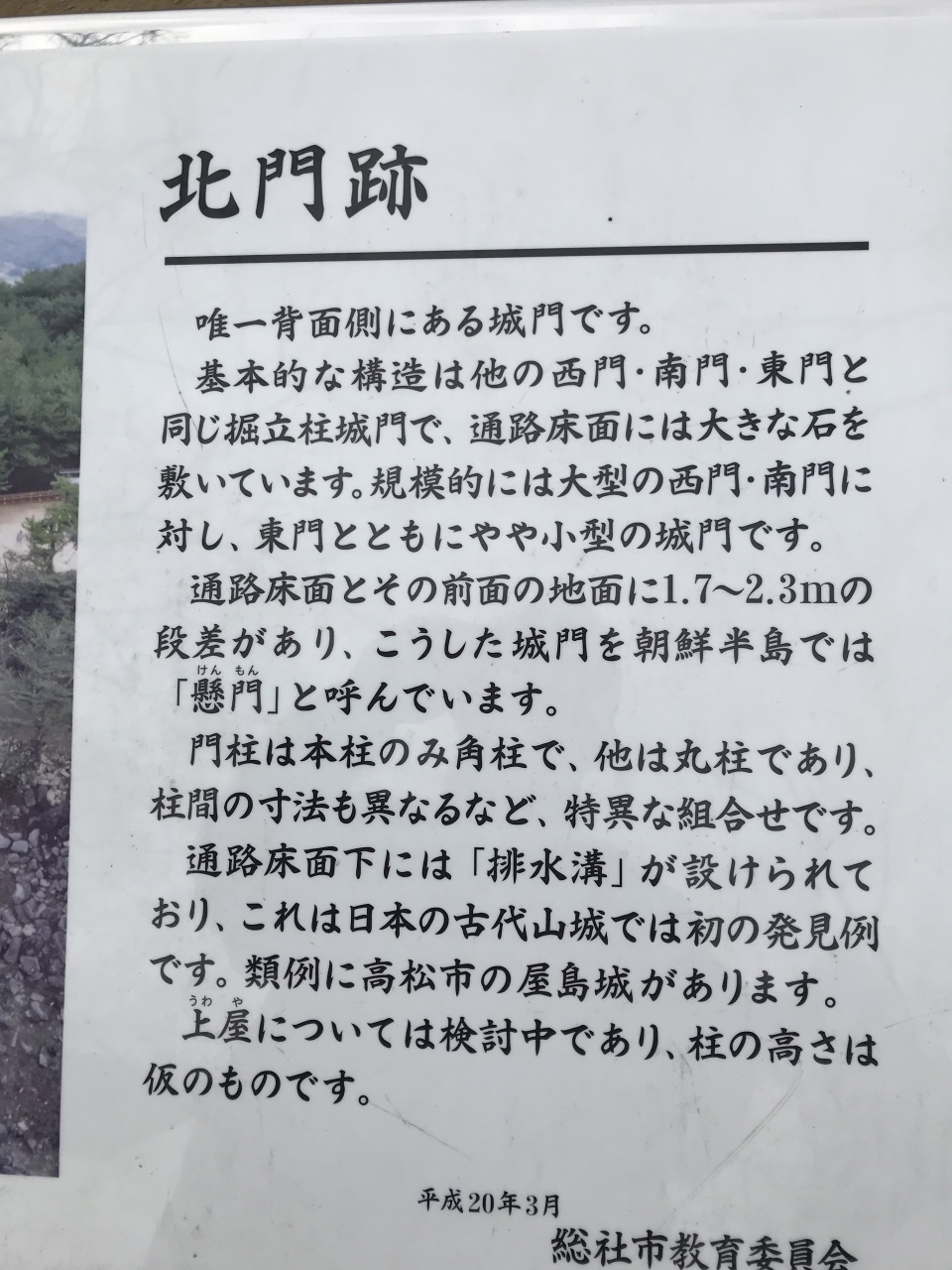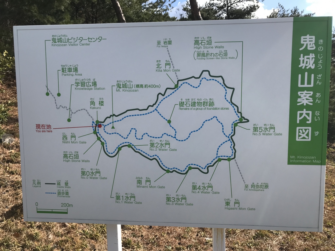 663年の白村江の戦いに敗れた大和朝廷が追い打ちを掛けてくるかもしれない明・新羅連合軍に備えて築城した古代山城とのこと。現... 続きを読む在は海と結構離れているので何でこんなトコロにと思ってしまいますが約1350年前は海岸線がもっと近かったようです。西門のみ復元されていますが北東南とも門の遺構は残っています。屋島城の門も似た感じで同時代性を感じました。駐車場-西門-北門-東門--南門-西門-駐車場と1週廻りました。それなりの高低差もある約1時間半近く掛かる広域なお城でした。古代山城として、讃岐の屋島城や肥後の鞠智城より遺構がしっかり残っており興味深いお城です。 閉じる