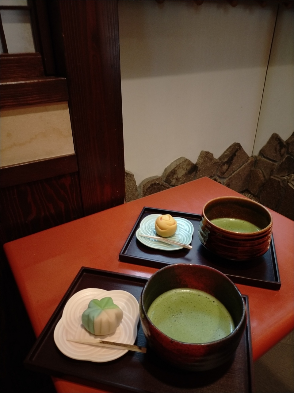 台所の先には「寒村庵」というカフェがあります。抹茶と和菓子のセットで700円です。カウンター席から中庭を眺めながらゆっくりと寛ぐことができます。和菓子は「かいしき」と呼ばれる紙の上に置かれお盆に載せて運ばれてきます。給仕の女性がお盆から「かいしき」を持ち上げてお客の前に置く仕草には、「お茶屋」ならではの風情があります。