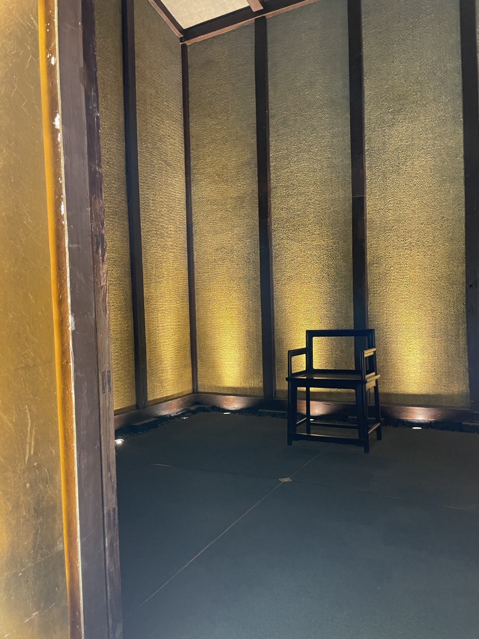 「懐華楼」は、玄関を入るとすぐに目にする朱に塗られた階段があります。階段を上ると漆塗りの屏風があり、その先には広々としたお座敷が用意されています。昼間の時間帯は襖がすべて取り払われていますが、夜になると、ここに襖がはめ込まれ客間が2つできます。「見せの間」をはじめ、「茶の間」「中の間」「奥の間」などのお店で働く人たちのお部屋も一般向けに改装しています。また、かつての「見せの間」にはカフェ「懐華樓カフェ」があります。金箔推しのメインストリートにあって、このカフェの看板メニューは「金箔くずきり」と「金箔ぜんざい」です。