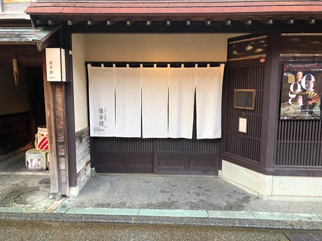 「懐華楼」は、築200年、文政3年(1820年)の「東の廓」の発足時からある「お茶屋」で、金沢で一番大きな「茶屋建築」で、金沢市の指定保存建造物です。「懐華楼」は、昼は一般に広く公開していますが、夜は一見さんお断りを貫き通して、今もなお、ひと晩に一組だけのお客様をおもてなしする「一客一亭」で華やかなお座敷が上げられているそうです。加賀藩の藩政期時代には、町家は平屋に限られていたことから、二階建ての建物が並ぶ風景は茶屋街独特のものだそうです。「懐華楼」の見どころは、ミシュランの旅行ガイドでも高く評価された鮮やかな朱塗りの階段をはじめ、豪華絢爛な客間、茶室などで、そこには、洗練された室内装飾と調度品が飾られています。