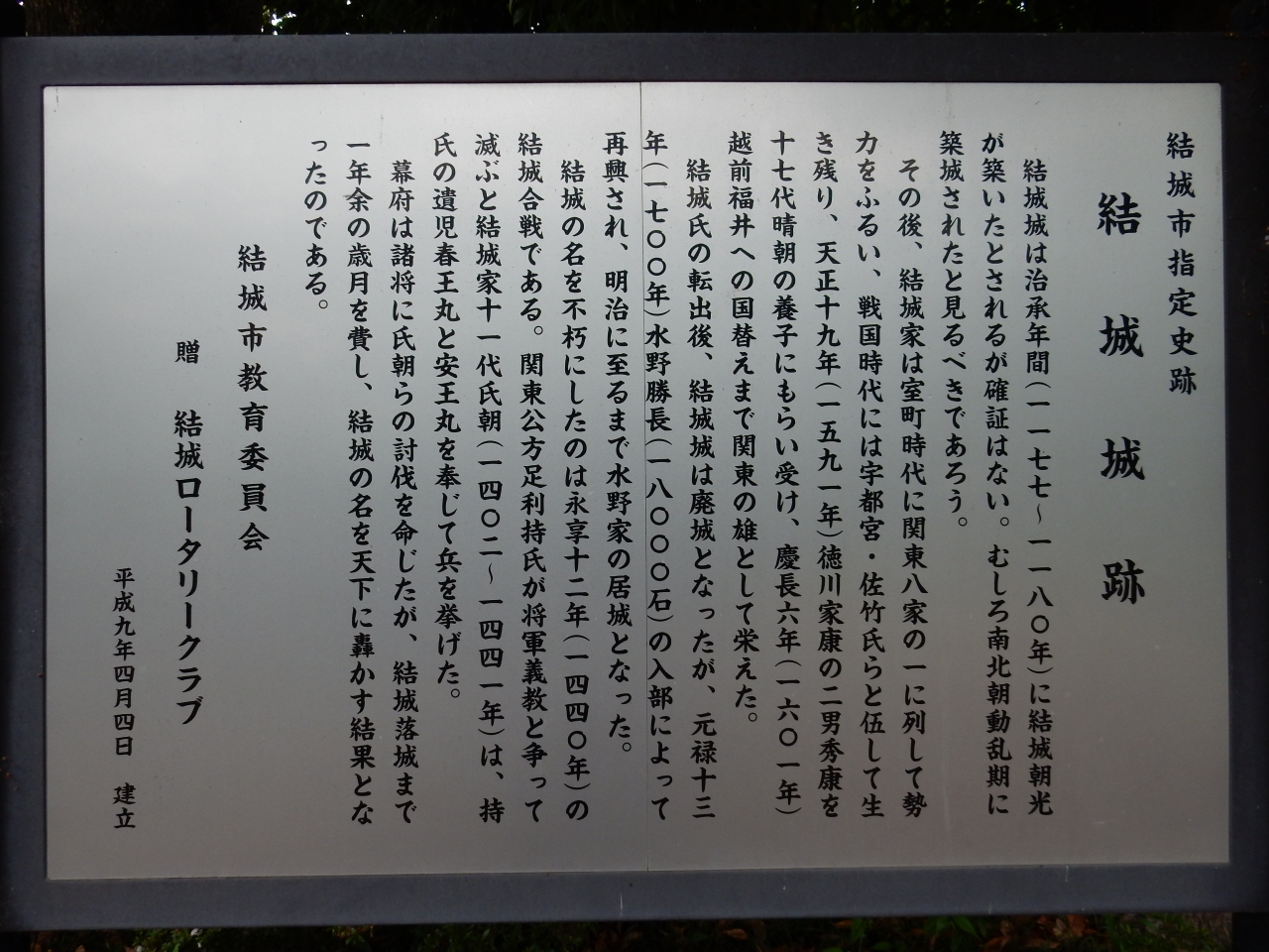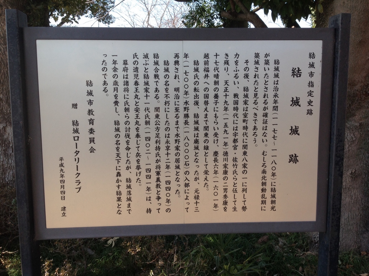 この結城城は室町時代の「結城合戦」の現場です。関東豪族であった結城氏が室町幕府へ反旗を翻した戦いであり、多勢の幕府軍に包囲されながら、1年間抗したましたが、落城したそうです。