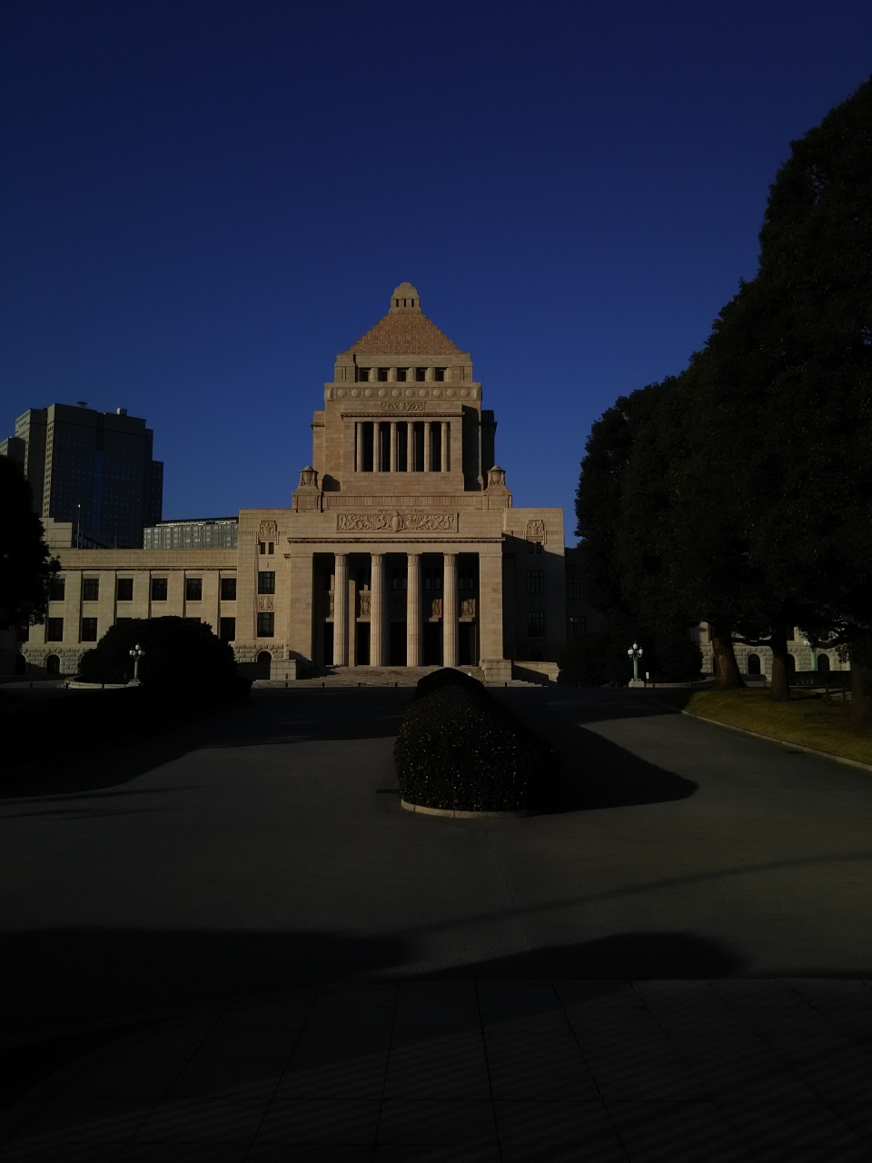 地下鉄桜田門駅の南西にある。数回来たことがあるが、内堀通りの国会前交差点から西側へ進むと、正面に国会議事堂が見える。建物は... 続きを読む明治時代に設計が始まり、昭和11年に竣工した。建物は左右対称形で、正面に向かって左側に衆議院、右側に参議院が配置されている。正門の横の柱にも、それぞれの名札が貼られている。門の横などには警官が立っているが、観光客が記念撮影をしていた。建物の形状はお墓のようだと以前から辛口の批判があるが、たしかにあまり素敵なデザインではない。議事堂内の本会議場傍聴席、御休所、皇族室、中央広間等は平日、だれでも見学できる。また、衆議院第1別館の衆議院面会受付所の隣には郵便局があり、誰でも利用できる。議事堂手前の両側には、国会前庭庭園があり散策を楽しめる。北側には国会図書館がある。国会議事堂やこの界隈に関心や知識のある方は訪問するのもいいかもしれない。 閉じる