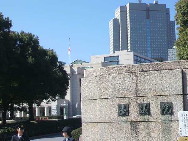 国会議事堂には、半旗、そして国会議事堂の向かいの憲政記念館には弔旗が掲げられていました。