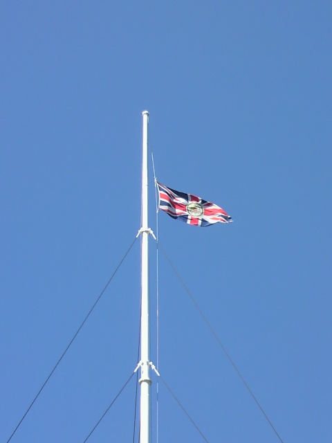 英国大使館では、旗竿の半分までと長辺分までと2つの方法で下げていました。