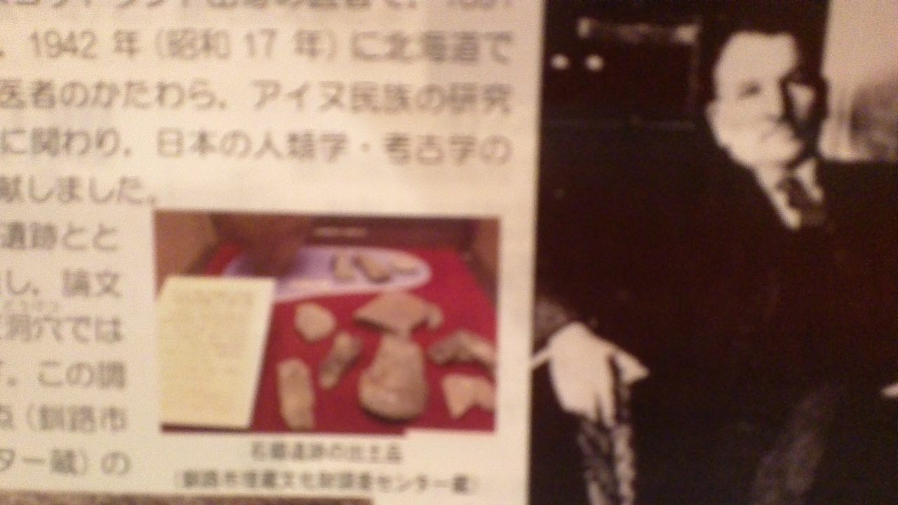 企画展はマンロー博士(イギリス・スコットランド)で、日本の人類学・考古学の基礎作りに貢献されたようで、アイヌ民族研究や他国内の発掘に関わった方々の発掘品の展示でした。