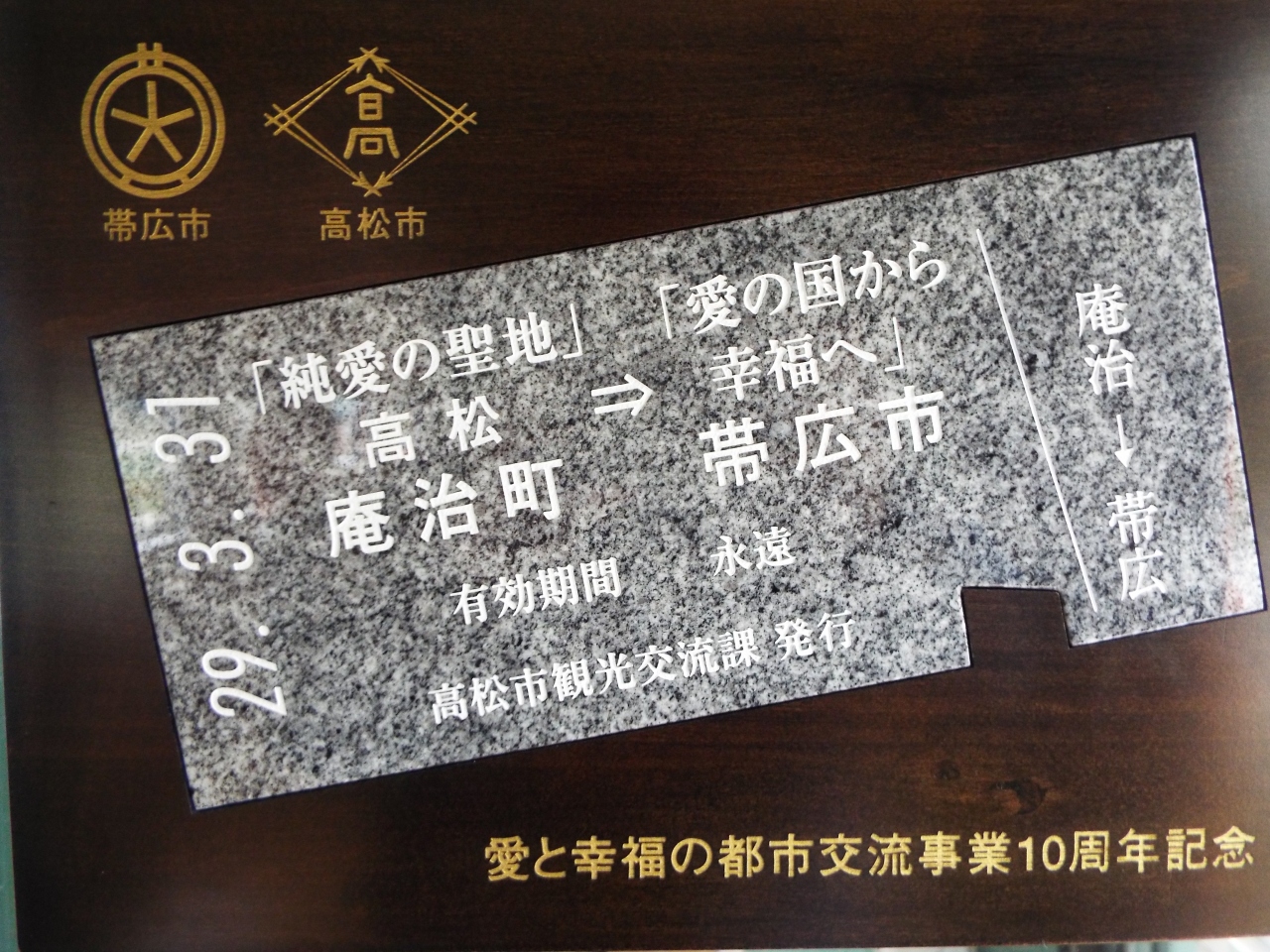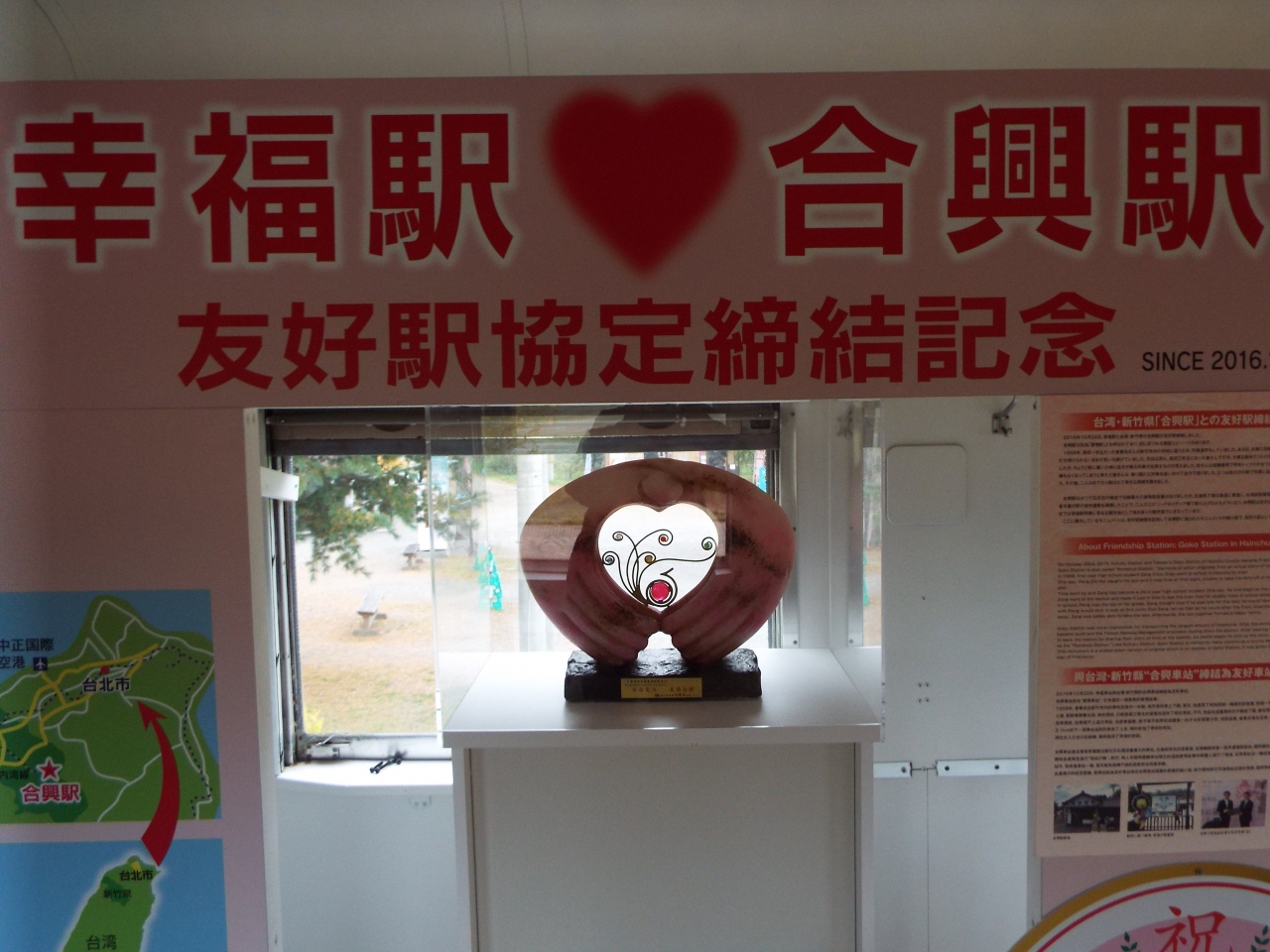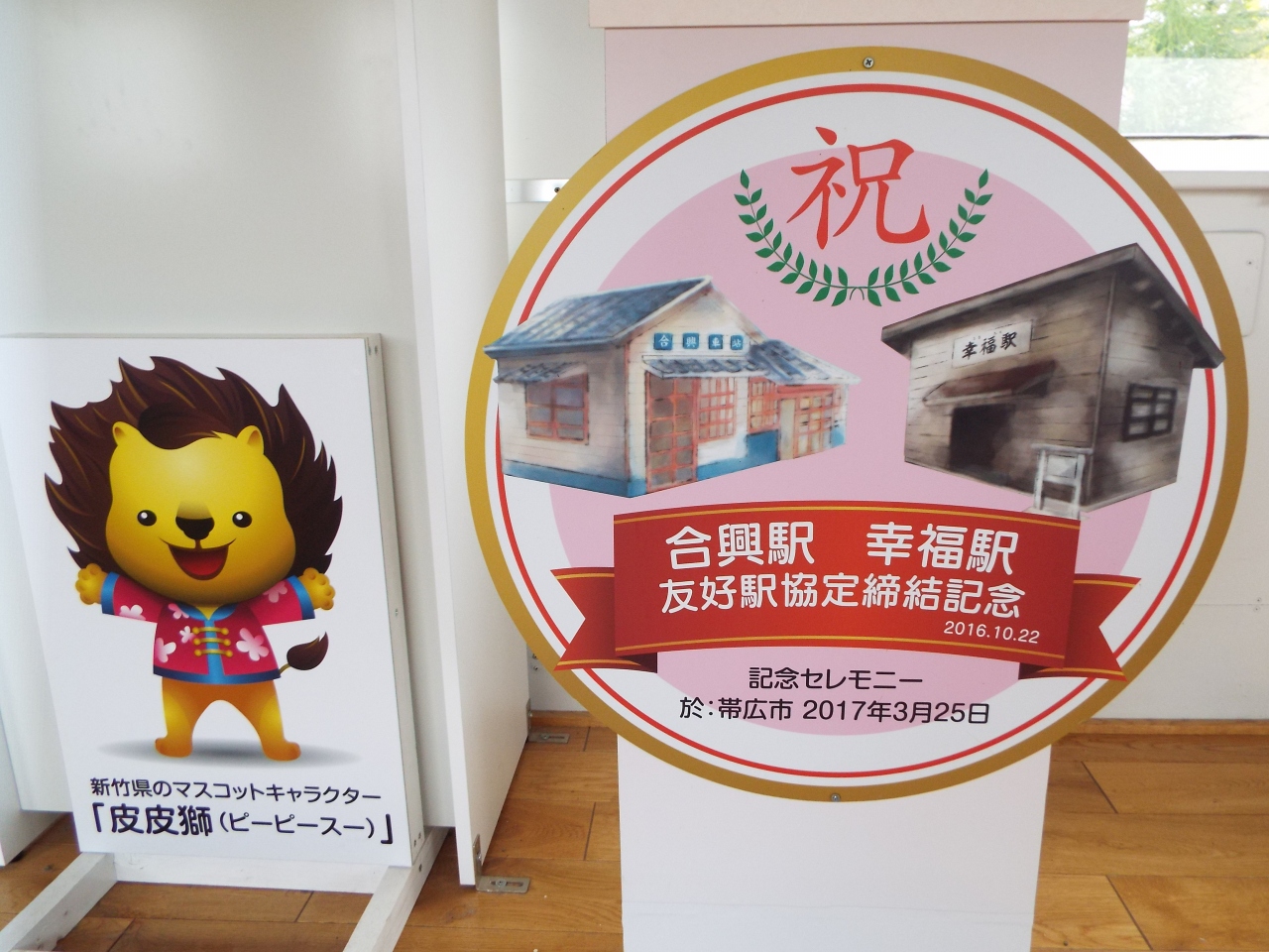 気動車の中で、台湾の合興駅と友好駅協定を結んだという記念セレモニーの看板を発見。