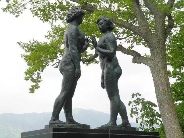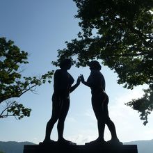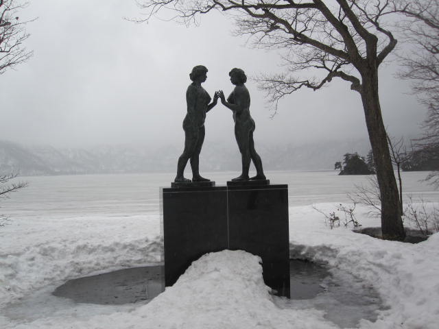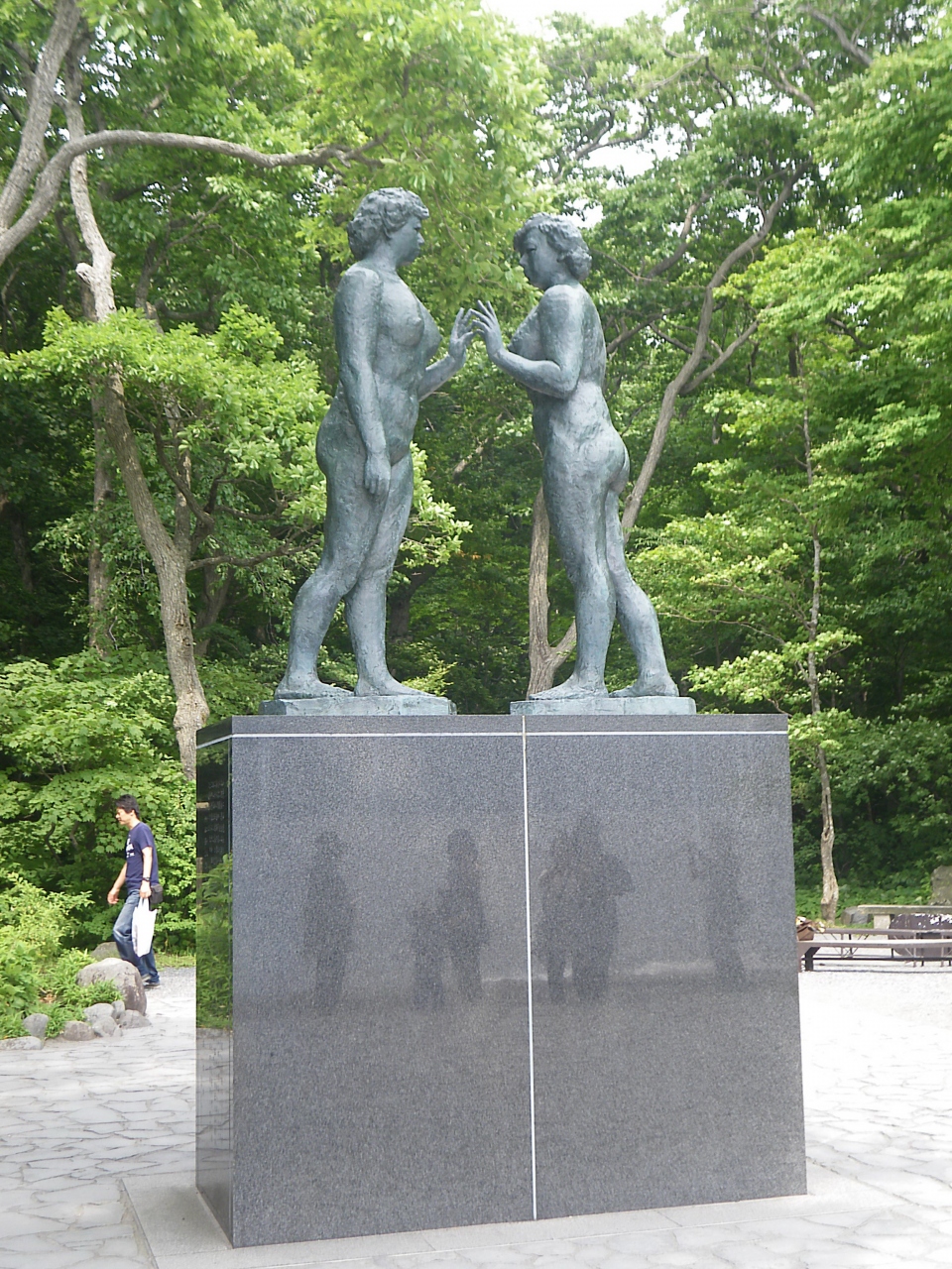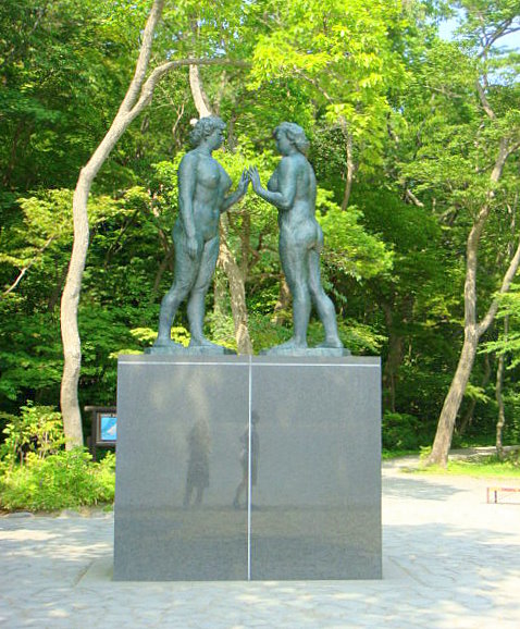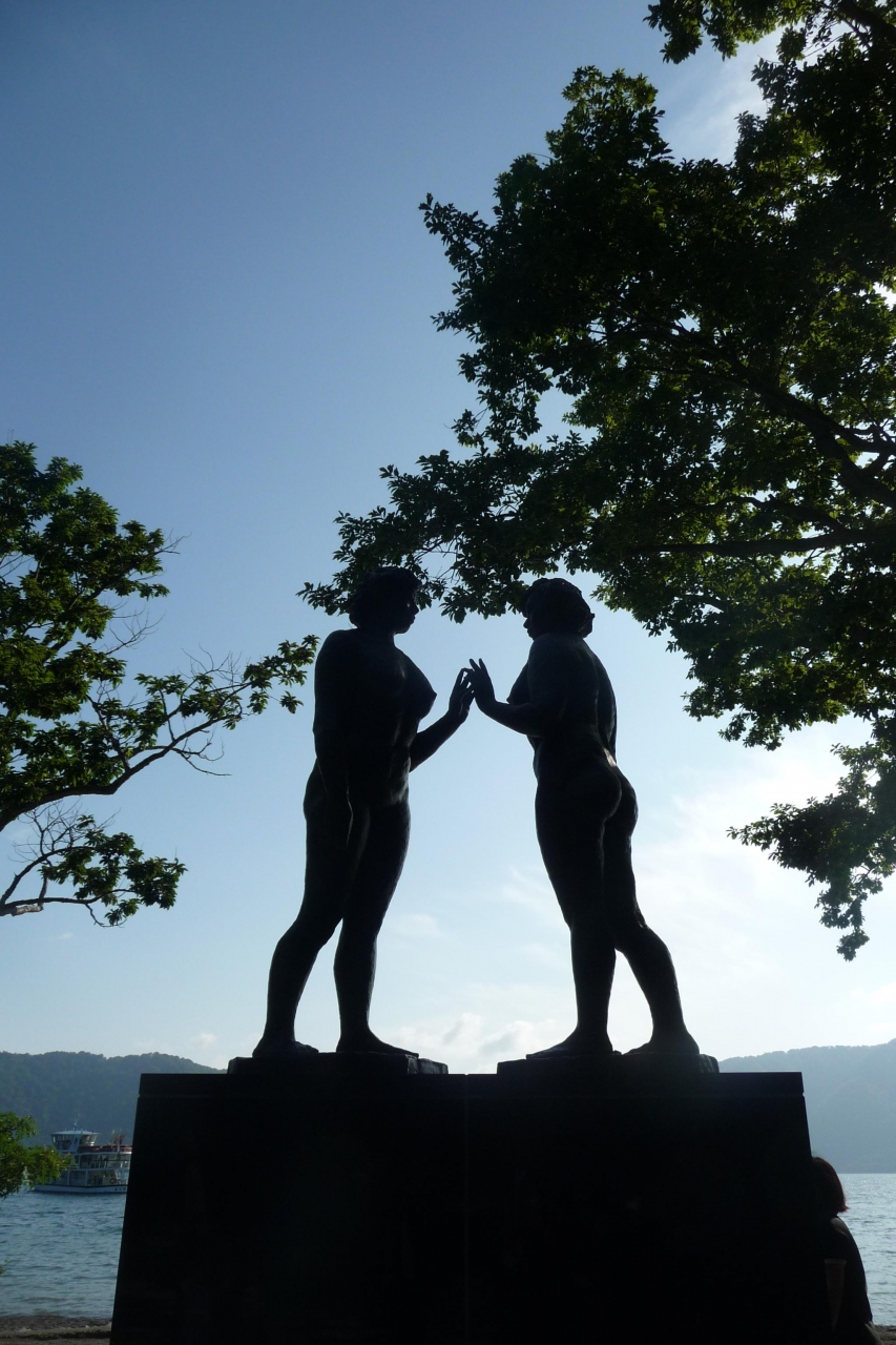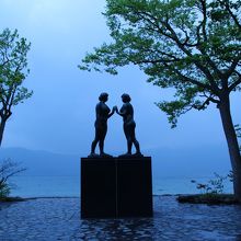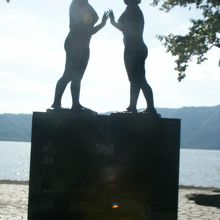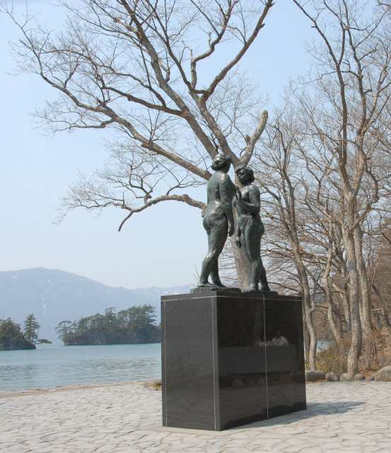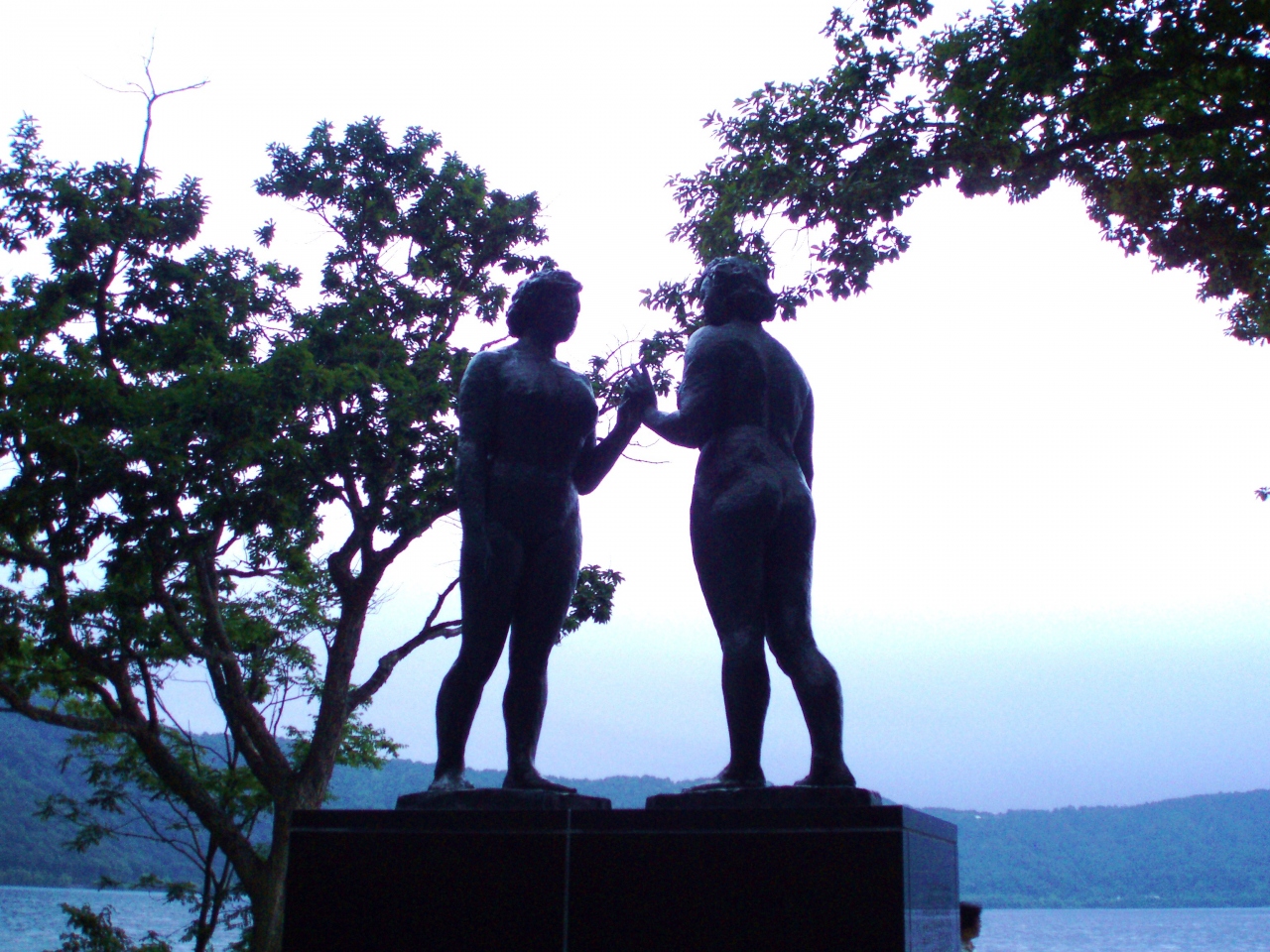 国立公園指定15周年記念事業として、十和田湖や奥入瀬を世に広く紹介し、国立公園指定に功績のあった、文人大町桂月、当時の青森県知事武田千代三郎、地元村長の小笠原耕一の3氏を称え、1953年(昭和28年)に十和田湖畔・御前ケ浜北端に建てられた。作者は「智恵子抄」で知られる高村光太郎。互いに左手を合わせる形で向き合う高さ2.1mの2人の裸婦像には、病弱だった妻・智恵子への想いが込められているといわれ、神秘の湖・十和田湖の象徴的存在。