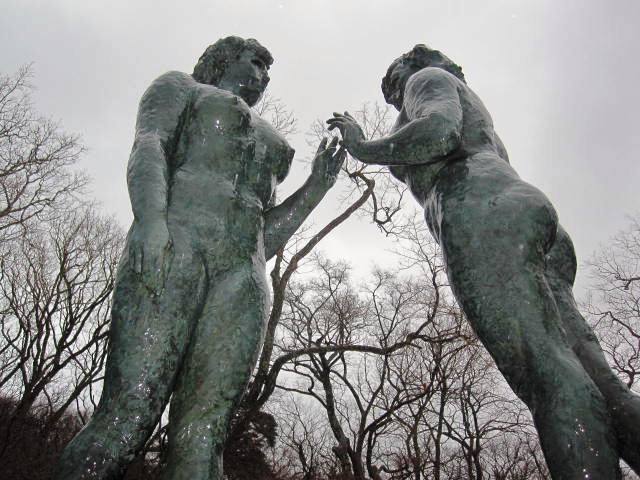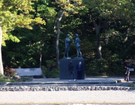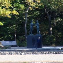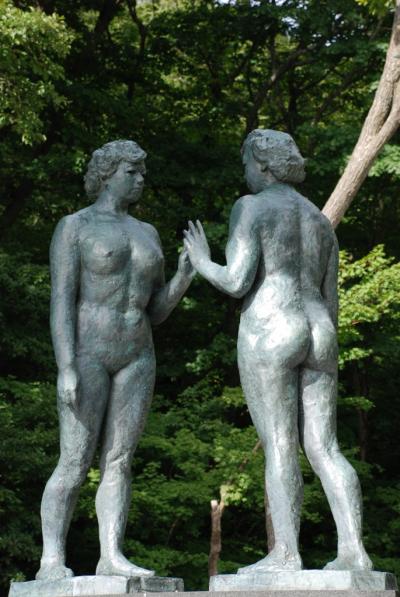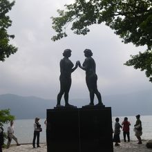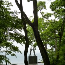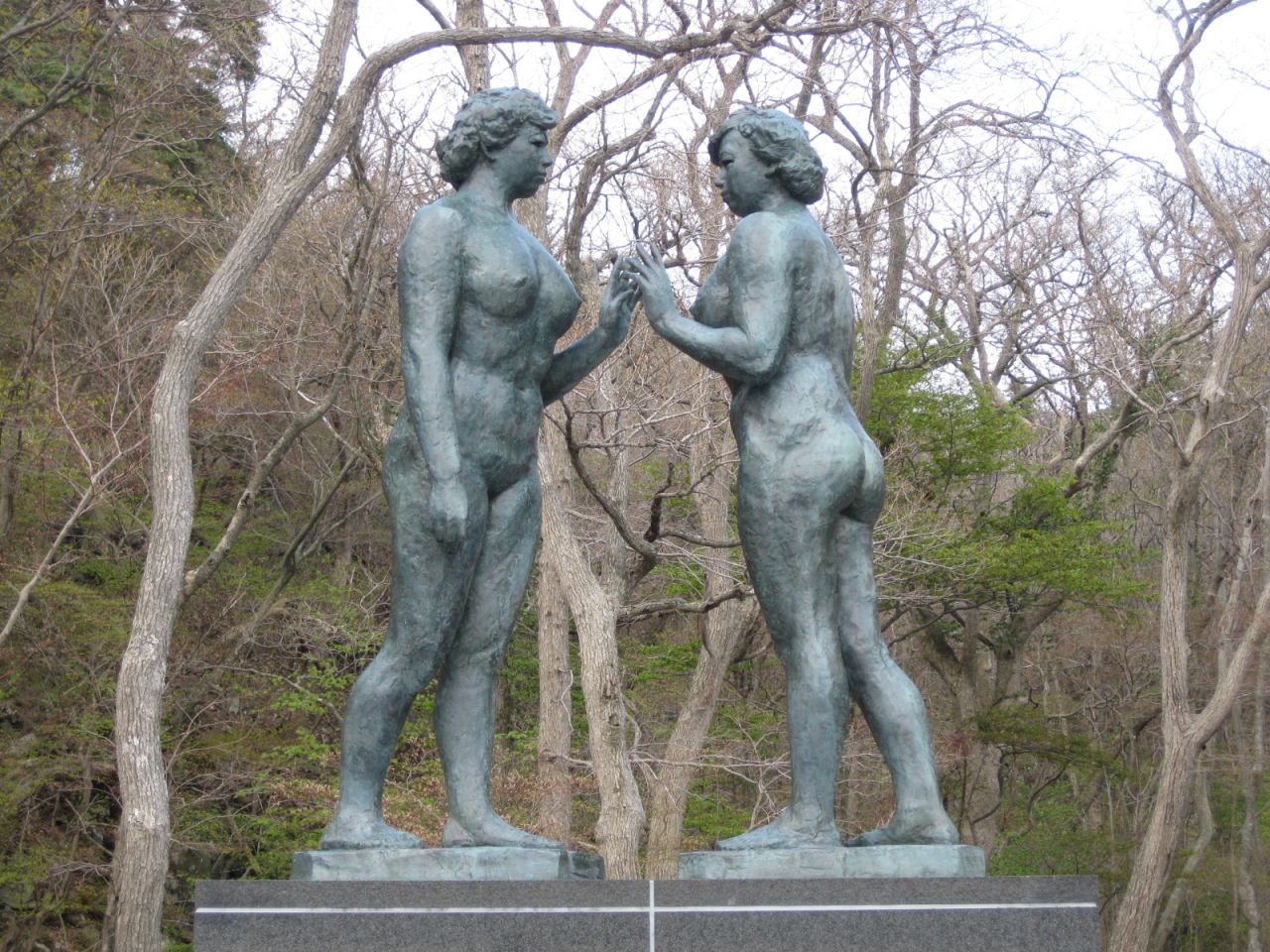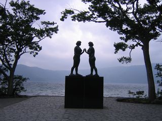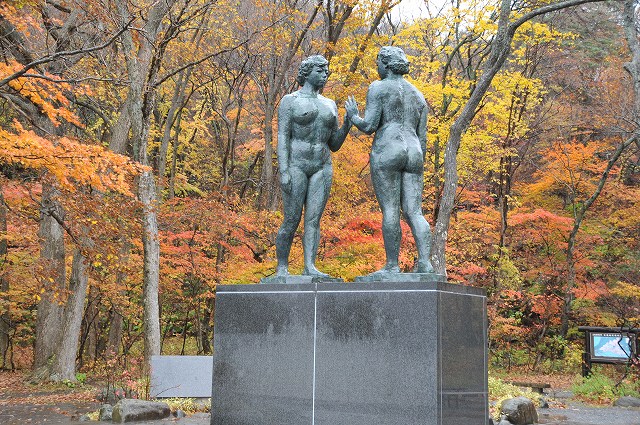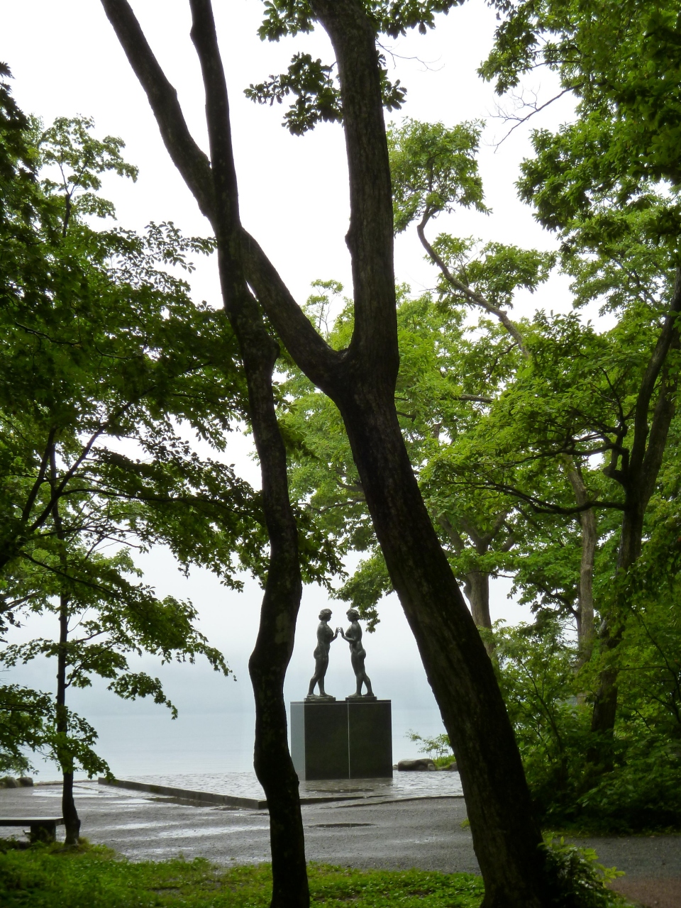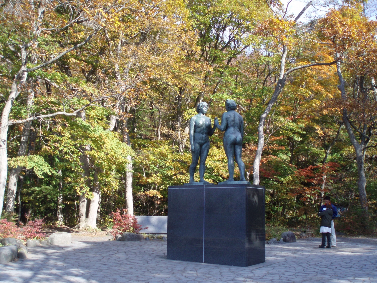 国立公園指定15周年記念事業として、十和田湖や奥入瀬を世に広く紹介し、国立公園指定に功績のあった、文人大町桂月、当時の青森県知事武田千代三郎、地元村長の小笠原耕一の3氏を称え、1953年(昭和28年)に十和田湖畔・御前ケ浜北端に建てられた。作者は「智恵子抄」で知られる高村光太郎。互いに左手を合わせる形で向き合う高さ2.1mの2人の裸婦像には、病弱だった妻・智恵子への想いが込められているといわれ、神秘の湖・十和田湖の象徴的存在。