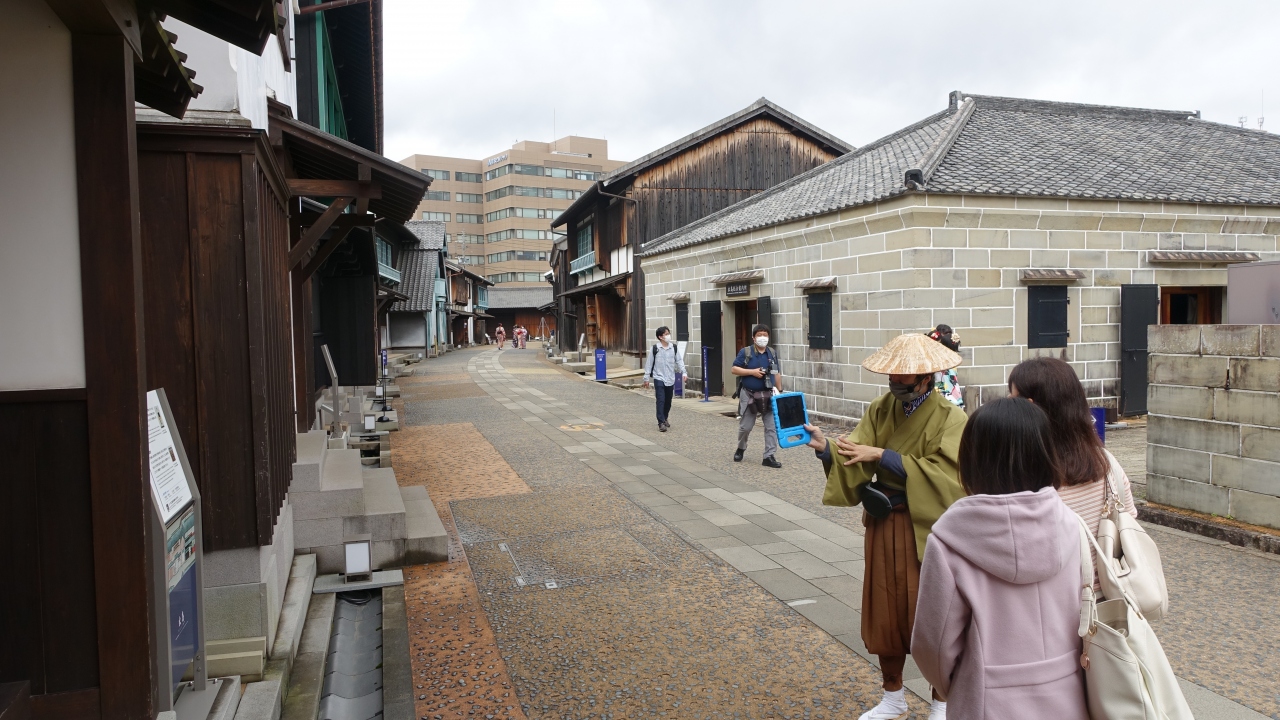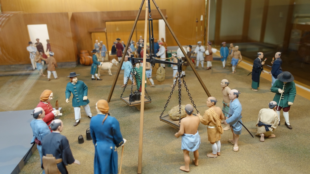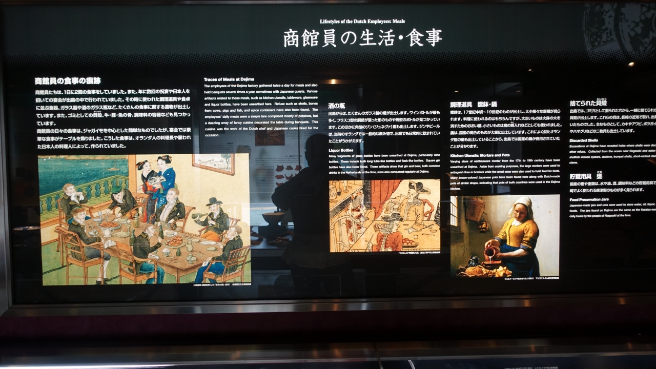 出島の復元計画が動き出したのは昭和26年。現在16の建物が復元され19世紀初めの街並みが蘇っている。展示内容はオランダ商館で働くオランダ人の生活、ヨーロッパから持ち込まれた科学技術や道具類、最大の輸入品だった砂糖の荷揚げや保管の様子など多岐に及んでいる。建物類も日本建築にオランダ風のベランダや窓枠を設けるなど異国情緒が味わえる。会場では達付袴に菅笠といった乙名(出島で働いた日本人の役人)姿のガイドさんがタブレットを使って説明してくれる。