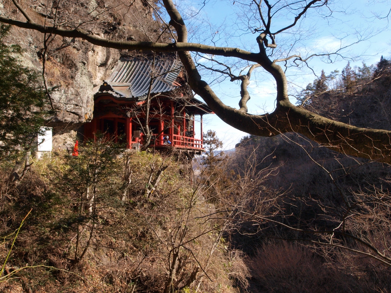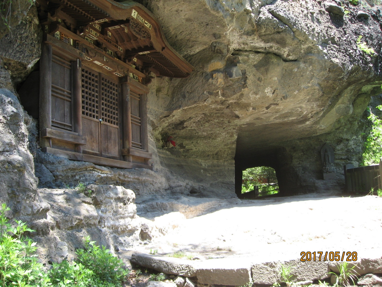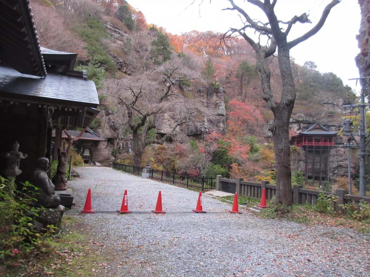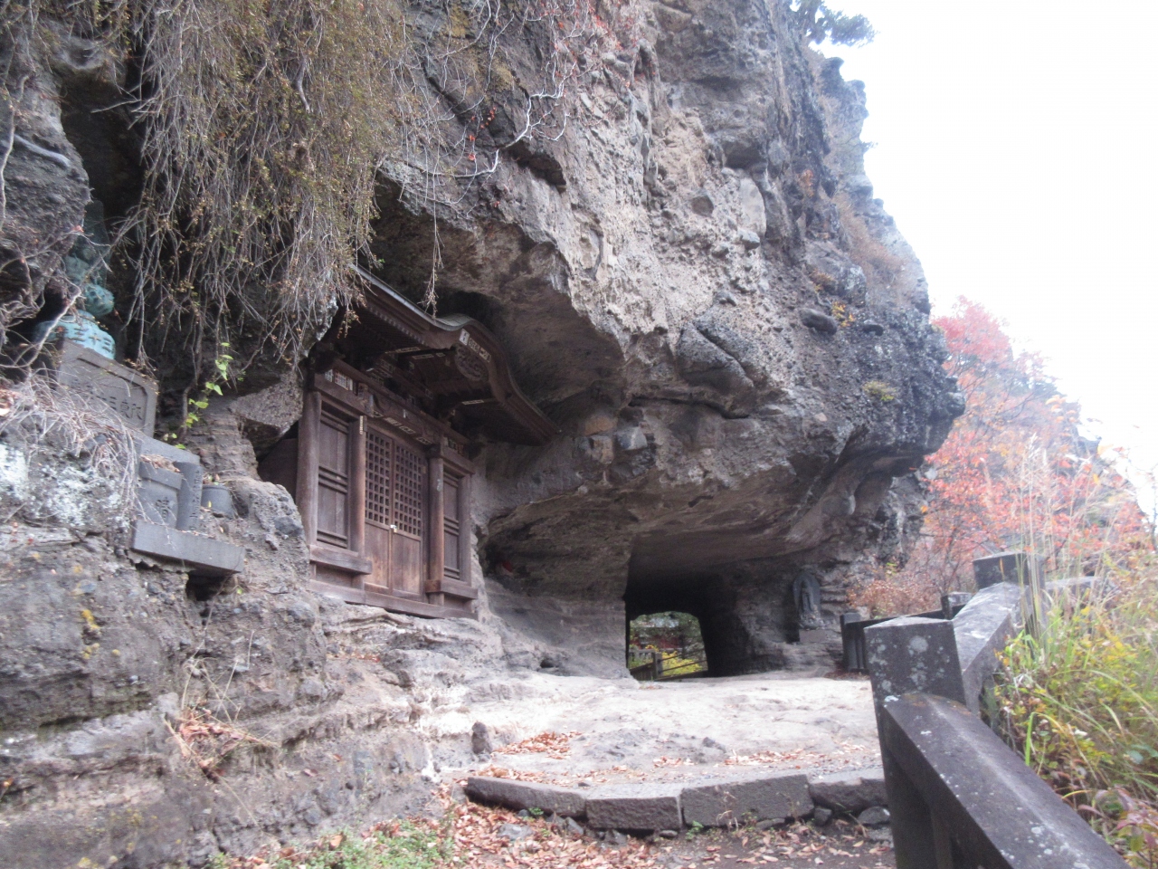 そして寺務所の前を通って、岸壁をくり抜いた洞窟を抜けると観音堂となります。観音堂の舞台からの景色はなかなかのもので、若干ですが小諸市街も望めます。紅葉のシ−ズンなら最高と思われます(残念ながら今回は少し遅かったようです)。