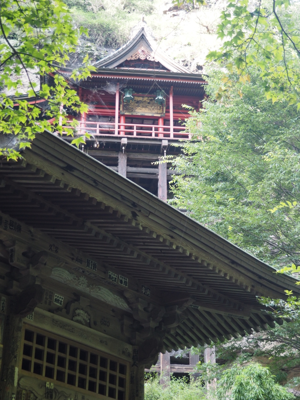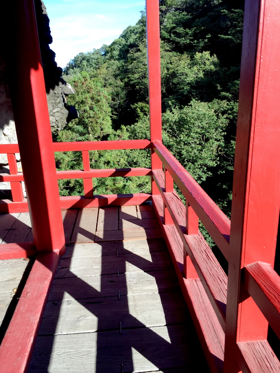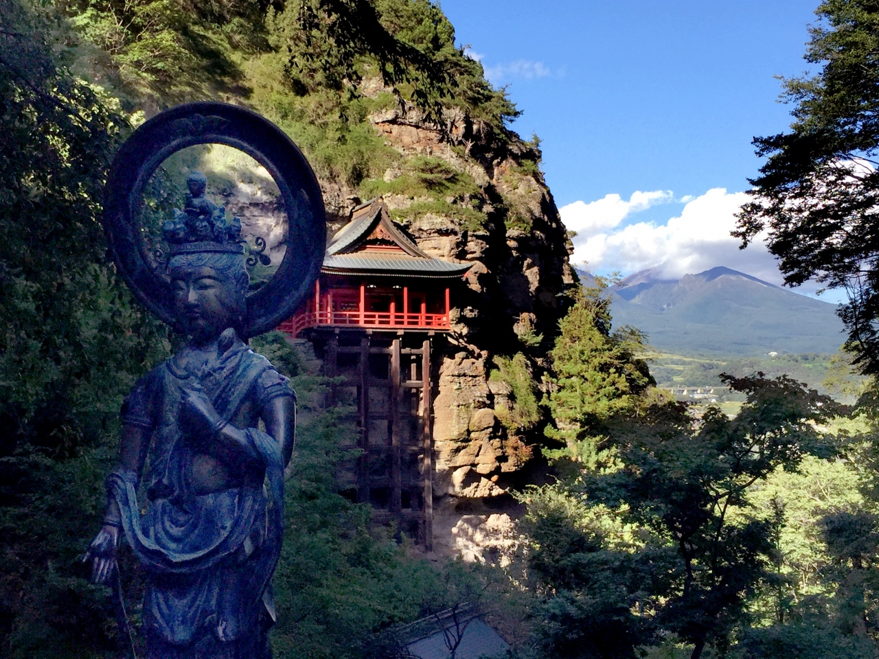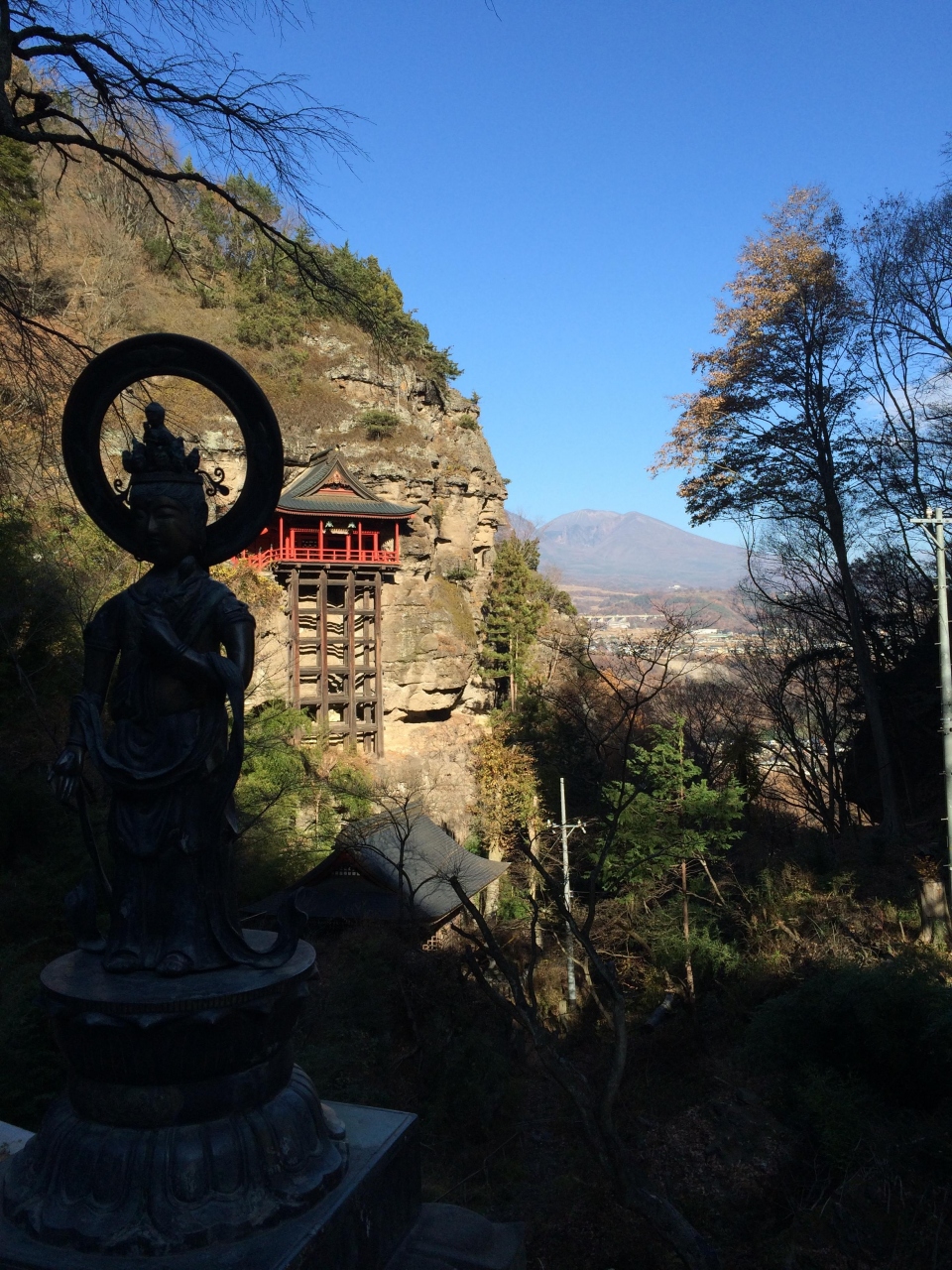 そして寺務所の前を通って、岸壁をくり抜いた洞窟を抜けると観音堂となります。観音堂の舞台からの景色はなかなかのもので、若干ですが小諸市街も望めます。紅葉のシ−ズンなら最高と思われます(残念ながら今回は少し遅かったようです)。