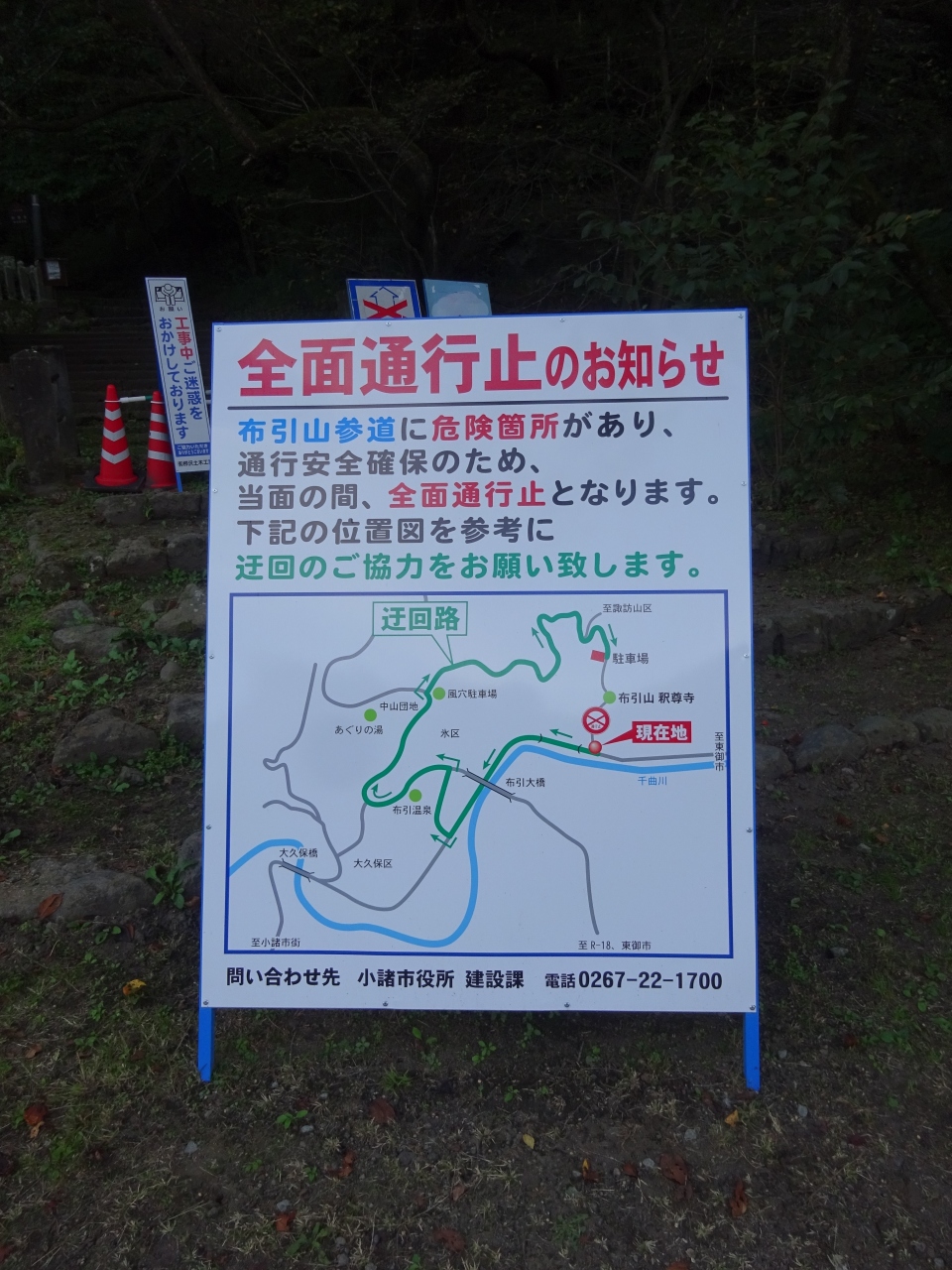 案内板を見たら、県道153号線と林道布引線を通り、本堂の横に行けるようでした。確か前に来た時に、本堂の横に車があったので車で行けるのはわかっていましたが駐車スペ-スがなかったし、参道の雰囲気がよかったため車での参拝は全く考えていませんでした。ただ参道が通行止めとなると車で行くしかありません。 まずは駐車場前の県道40号線で県道153号線(あぐりの湯に行く道)に行き、約1km走ると右側に「氷風穴駐車場」があります。そこが「林道布引線」の入り口で、約2kmで布引観音の駐車場に到着します。ただ林道は、道の状態は悪くはないのですが道幅は狭く車1台がやっと通れるくらいの上、対向車とすれ違えるスペ-スも非常に少ない(200~300m毎)です。さらに見通しも悪いため、マイクロバスや大型車両は通行できません。なお本堂の約200m上に7~8台分の駐車スペースはありました。 今回は、途中から戻りたかったのですがUターンできる場所はなく、運よく行きも帰りも対向車が無かったため無事参拝することができました。