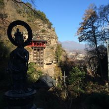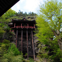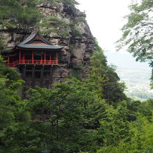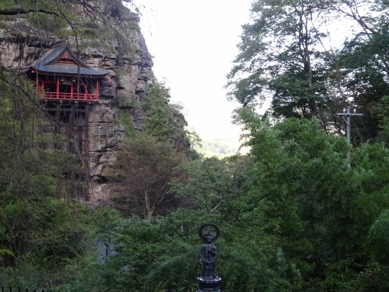 早い人で10分、のんびり登ってきても15分で、寺務所へ着きます。その寺務所の右側を見ると、そびえたつ崖に観音堂が見えます。ここからの観音堂が一番綺麗に見えると思います。たぶん清水寺を思い浮かべる人が多いと思います。