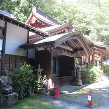 ほぼ頂上である寺務所まであと約2分の所に、古い山門(仁王門)が見えてきます。この山門の真上にそびえたつ崖に観音堂があるのですが、初めての人はほとんど気づかず登っていきます。