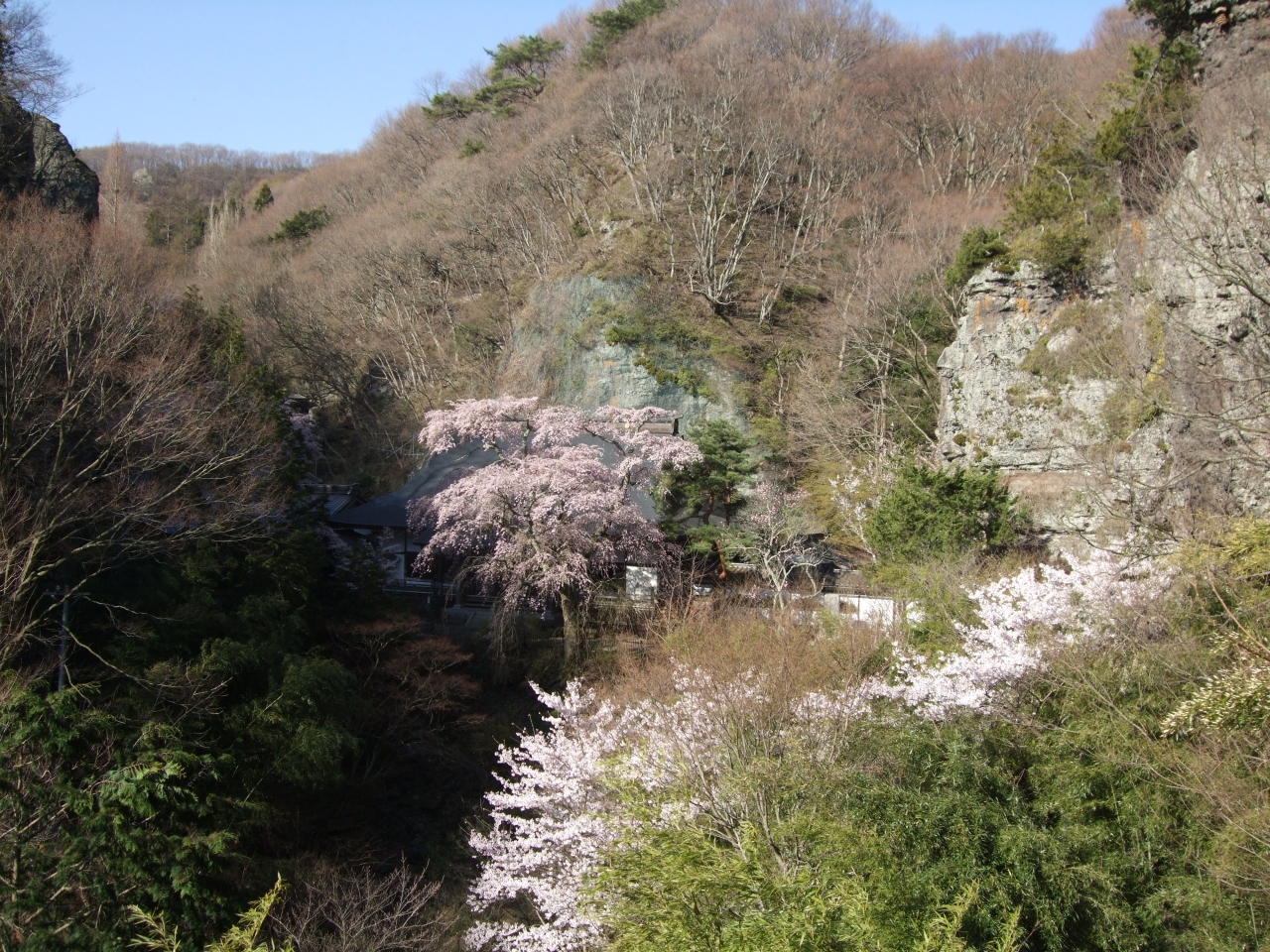 布引観音は、奈良時代に行基が開き、聖徳太子の聖観音を祀ったという歴史ある天台宗の名刹。しかし、有名なのは「牛にひかれて善光... 続きを読む寺」の伝説の舞台となったとなったことでしょう。これは強欲なおばあさんを牛に姿を変えた観音さまが善光寺まで連れて行き、改心させたというもの。観音堂は崖に張り付いたように建てられていまして、危なっかしい姿。本堂から、その観音堂とその横に浅間山を眺めるのが絶景です。写真は、観音堂から逆に本堂を眺めたもの。桜が見事に満開でした。また、善光寺とのつながりは、参道途中の洞穴。善光寺で火事が起きた際に、この洞穴から煙が出たのだとか。確かに、そんな雰囲気ですね。なお、小諸市内からは4キロあります。健脚の方にお勧め。