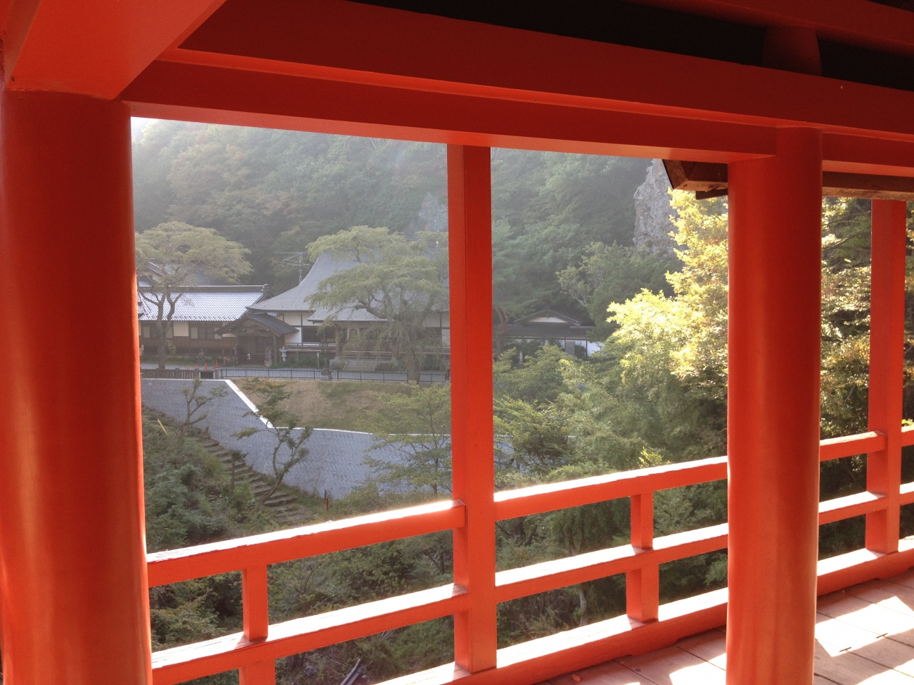 本堂のある広場から振り返ると山の中腹に朱塗りの観音堂が映える。観音堂の床板から少し下が透けて見えるのは高所恐怖症の人にはきついが、ここからの眺望はとても素晴らしい。