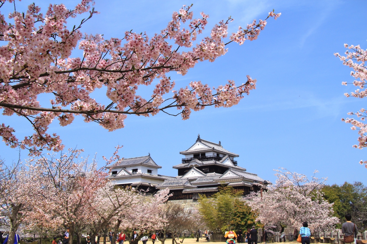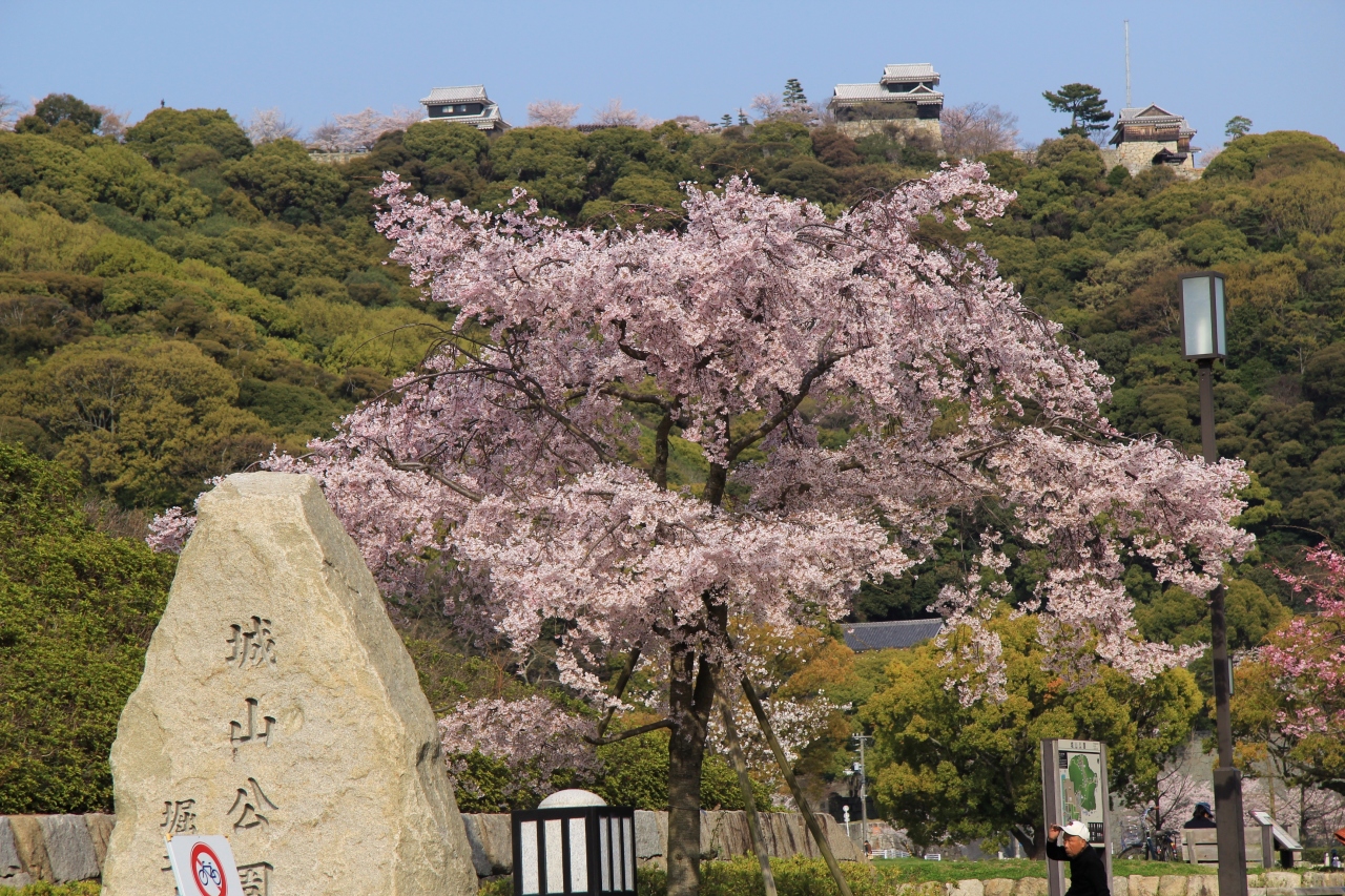 松山のほぼ中心、勝山山頂に建つ名城。標高132mの勝山の山頂に佇み、市内のほとんどの場所から目にすることができる。姫路城・和歌山城とともに、日本三大連立式平山城の一つとして数えられている。慶長7年(1602年)に賎ケ岳七本槍の1人加藤嘉明によって、築城が開始され、寛永4年(1627年)に.完成。日本を代表する連立式平山城で、安政元年(1854年)に再建された天守が現存する。天守、櫓など計21棟が国の重要文化財に指定されており、「日本100名城」や「美しい日本の歴史的風土100選」にも選定されている松山市のシンボルである。松山市の中央、峰を切り崩し谷を埋めて作られた本丸は、桜の名所でもある。
