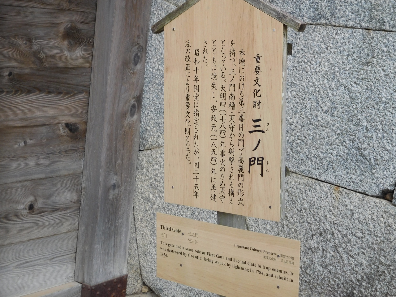 松山城の重要文化財の一つです。その名の通り「第3番目の門」で、高麗門の形式となっています。昭和10年に国宝に指定されたにも...  続きを読む関わらず、昭和25年に法の改正により、重要文化財に変更となったようです。この前の手前には、天守入口はこちらと案内があり、やっと天守にたどり着いた感がありました。  閉じる