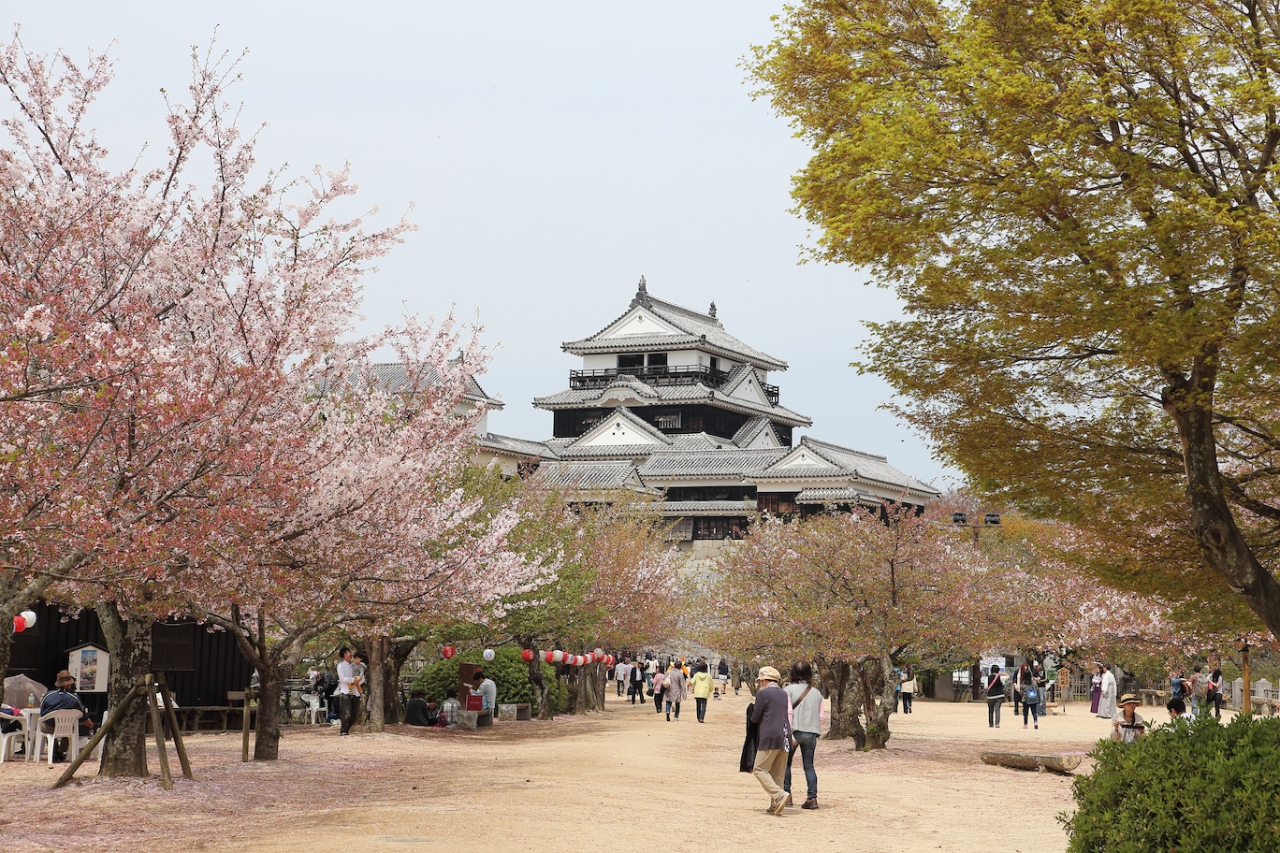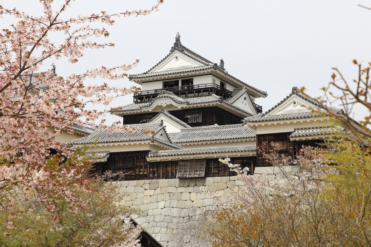 松山のほぼ中心、勝山山頂に建つ名城。標高132mの勝山の山頂に佇み、市内のほとんどの場所から目にすることができる。姫路城・和歌山城とともに、日本三大連立式平山城の一つとして数えられている。慶長7年(1602年)に賎ケ岳七本槍の1人加藤嘉明によって、築城が開始され、寛永4年(1627年)に.完成。日本を代表する連立式平山城で、安政元年(1854年)に再建された天守が現存する。天守、櫓など計21棟が国の重要文化財に指定されており、「日本100名城」や「美しい日本の歴史的風土100選」にも選定されている松山市のシンボルである。松山市の中央、峰を切り崩し谷を埋めて作られた本丸は、桜の名所でもある。