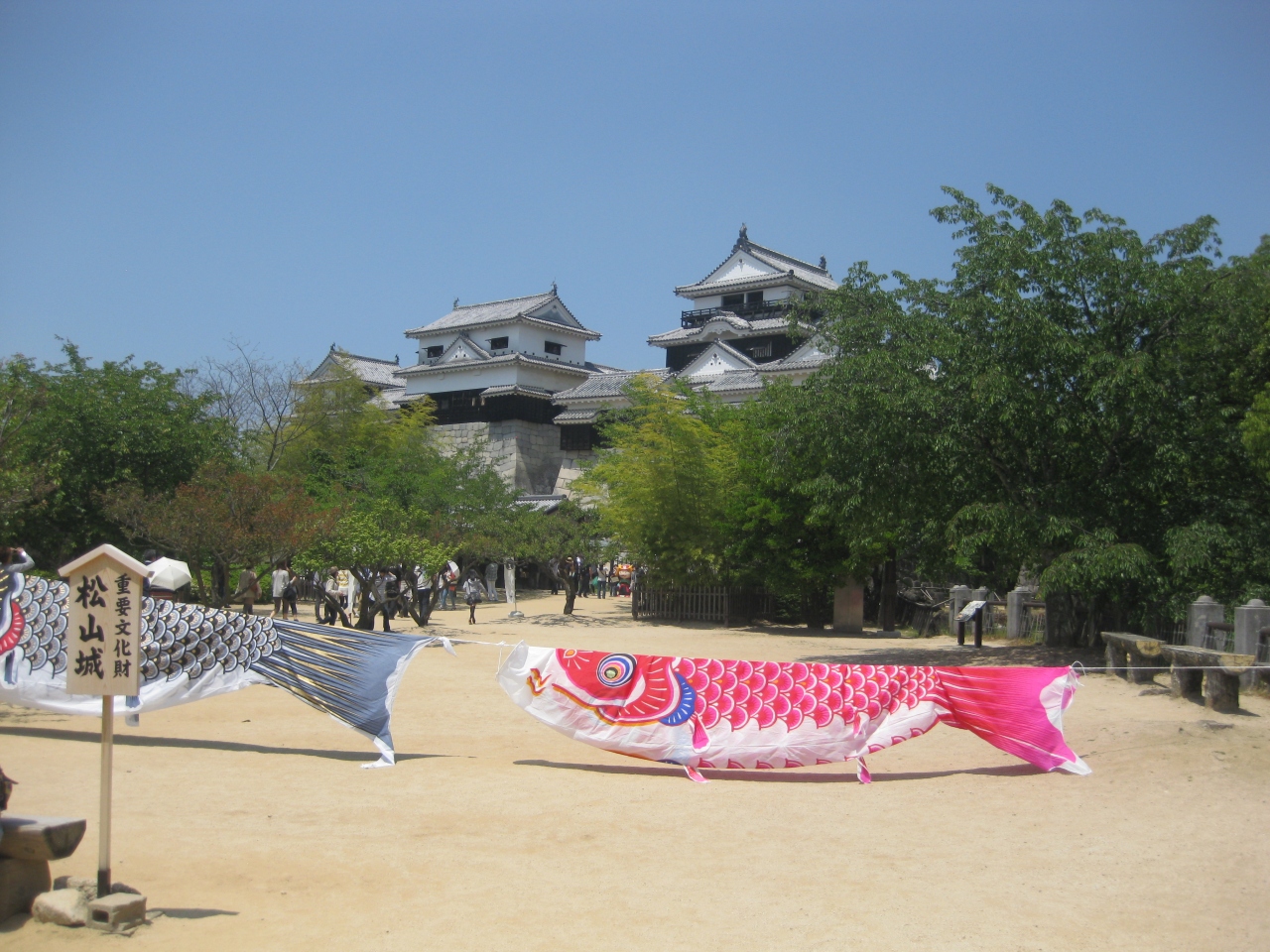 松山のほぼ中心、勝山山頂に建つ名城。標高132mの勝山の山頂に佇み、市内のほとんどの場所から目にすることができる。姫路城・和歌山城とともに、日本三大連立式平山城の一つとして数えられている。慶長7年(1602年)に賎ケ岳七本槍の1人加藤嘉明によって、築城が開始され、寛永4年(1627年)に.完成。日本を代表する連立式平山城で、安政元年(1854年)に再建された天守が現存する。天守、櫓など計21棟が国の重要文化財に指定されており、「日本100名城」や「美しい日本の歴史的風土100選」にも選定されている松山市のシンボルである。松山市の中央、峰を切り崩し谷を埋めて作られた本丸は、桜の名所でもある。