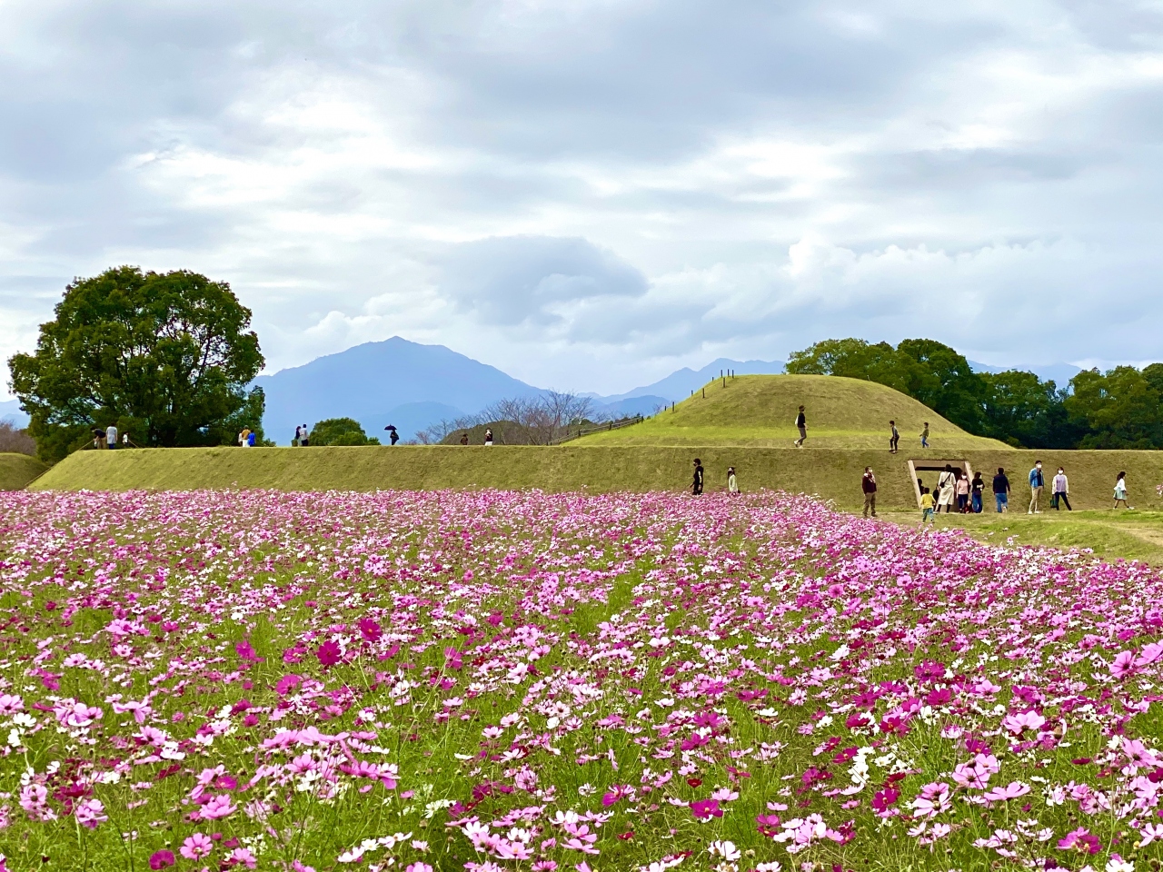 外堤と二重の周溝を持つ珍しい形の古墳とコスモス畑がなす風景を楽しめる