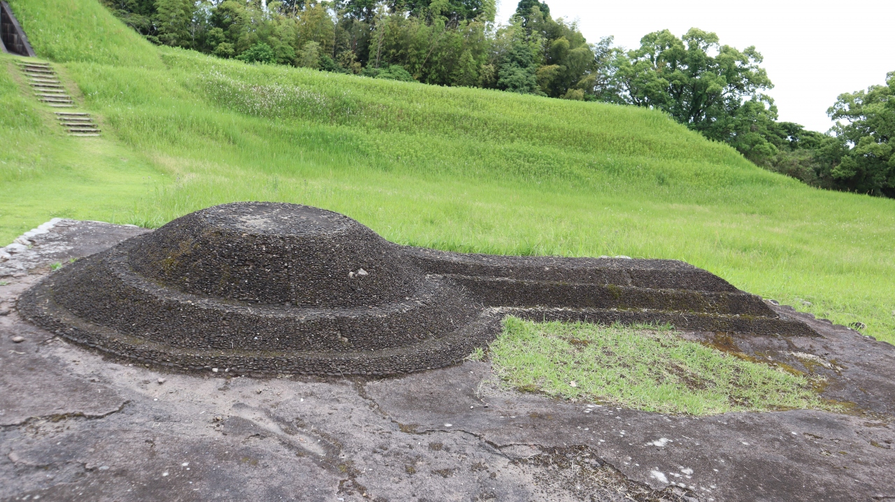 古墳の背後には高千穂の峰が見えて、神話の舞台を感じるロケーション