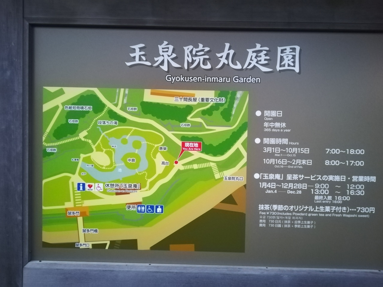 平成27年になって旧玉泉院丸に復元されたばかりなので真新しく、ちょっと珍しい池泉回遊式として有名な庭園ですが、城の上のほう... 続きを読むにあるわけではなく、鼠多門から入ることで手軽に訪れることが出来る立地なのはありがたいです。庭園内には玉泉庵という無料休憩所もあり、座って庭園を見晴るかすこともできるようになっています。ここの玉泉庵には併設された茶室があり、有料ではあるものの生菓子付きの抹茶もあるので、そういう意味でも休憩するには良いと思います。 閉じる