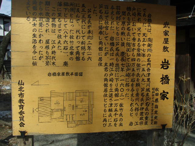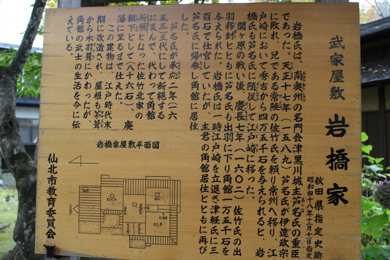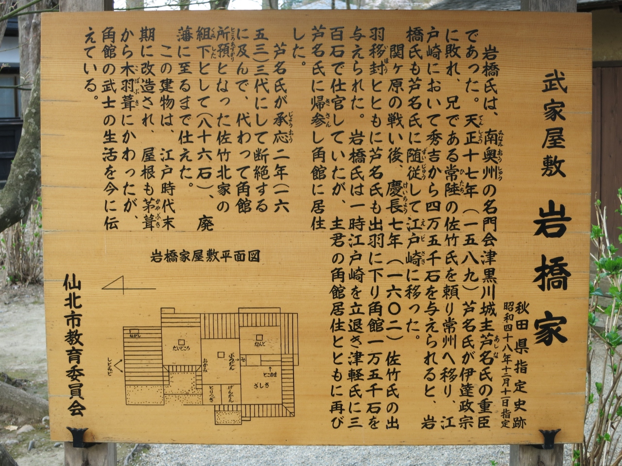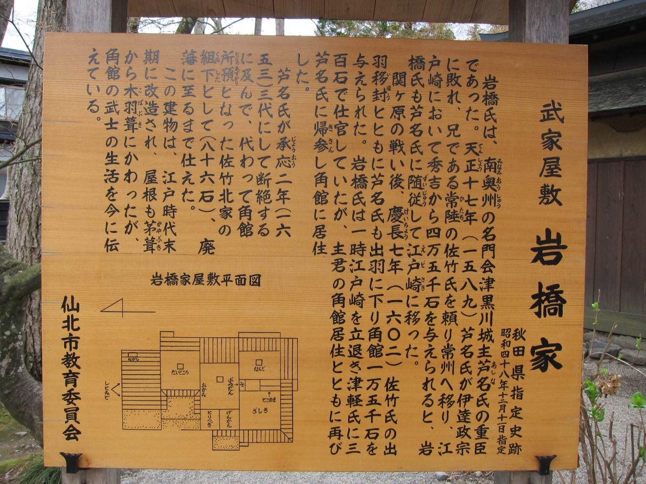 芦名の重臣。佐竹時代になり現在地へ移転。幕末の建築だが、その後の改造や増築が少なく、角館の中級武家住宅の特徴を随所にとどめている。明治期に茅葺から木羽葺きに屋根を改修しこれにより大火をまぬがれたと伝わる。カシワの大木は樹齢300年あまり。秋田県指定史跡。