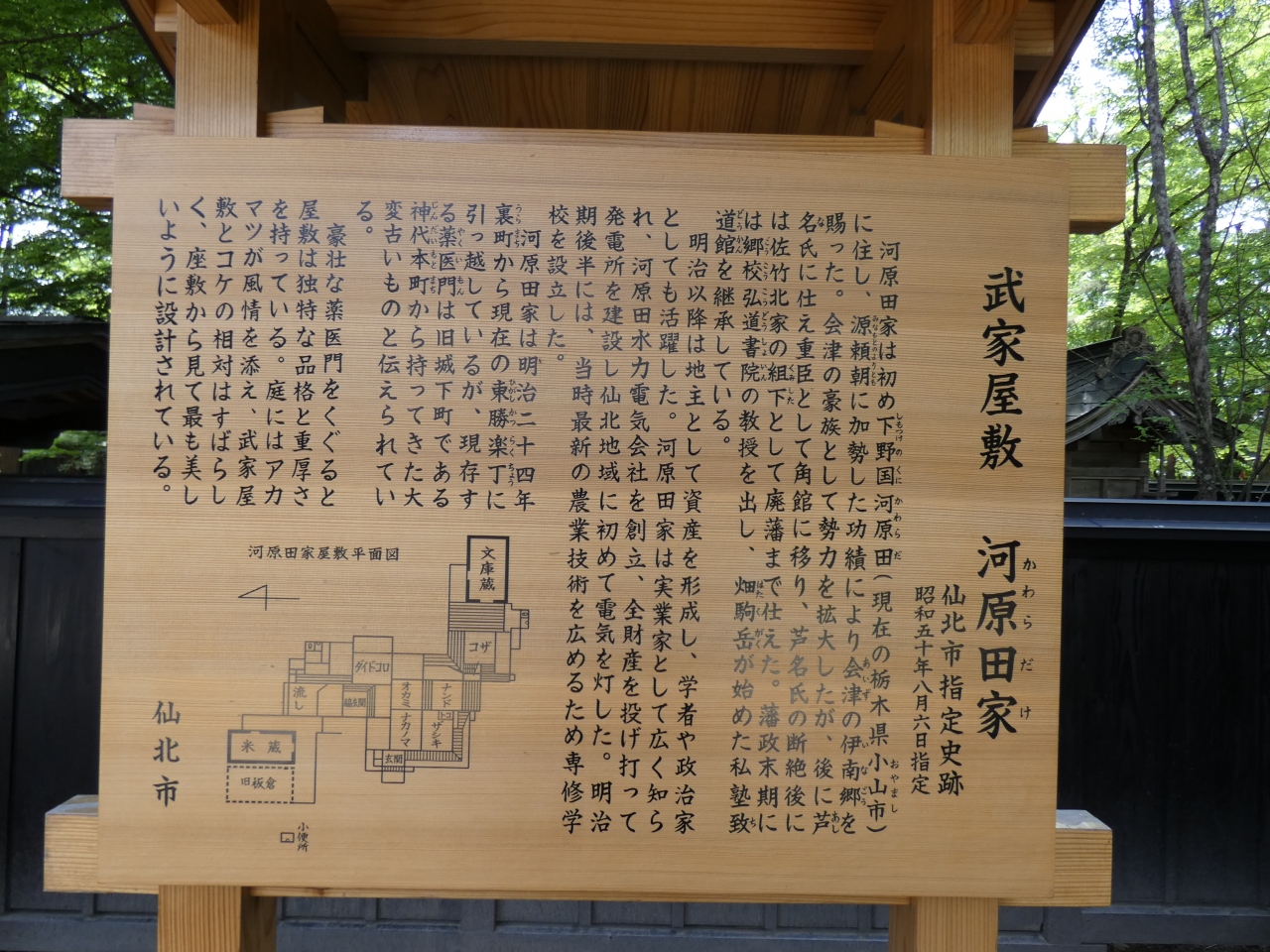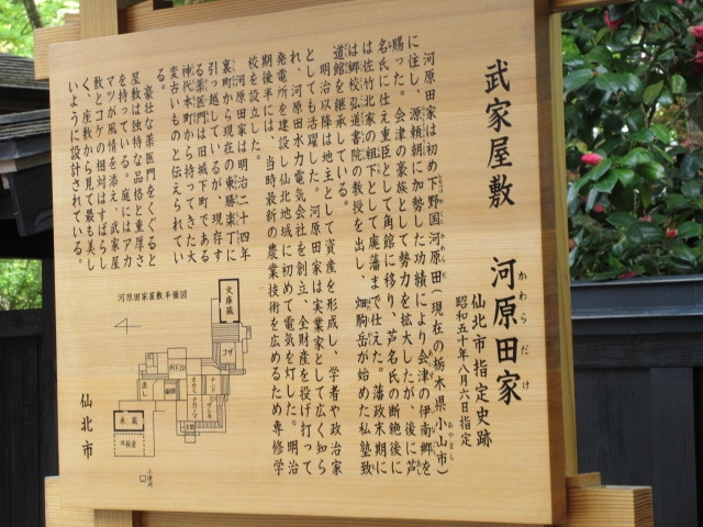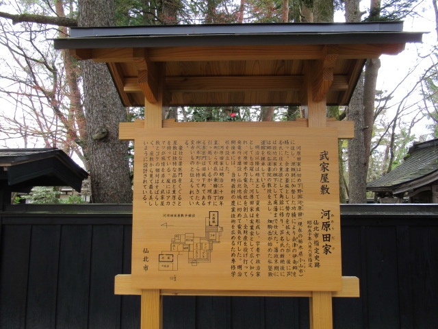 河原田家は、関ヶ原の戦い後に芦名氏の重臣として角館に移り、その後は佐竹北家に仕えました。 明治以降も学者や政治家を輩出し、第16代当主河原田次重は、私財で水力発電事業を手掛けるなど地域の発展に貢献しました。 仙北市指定史跡