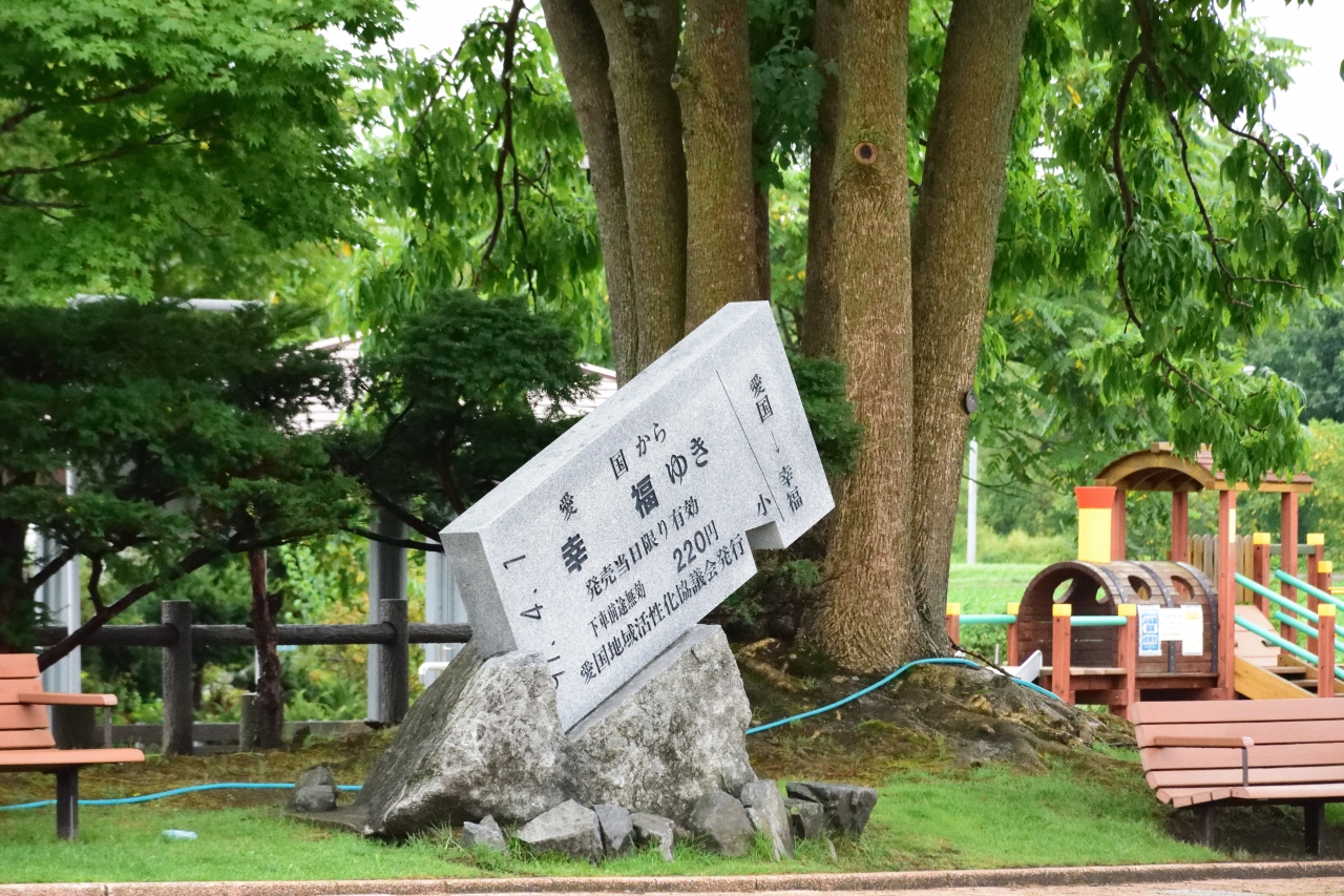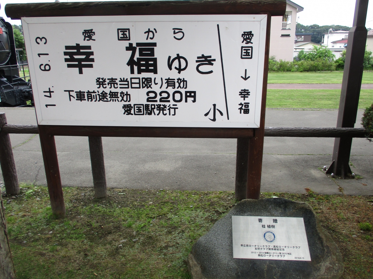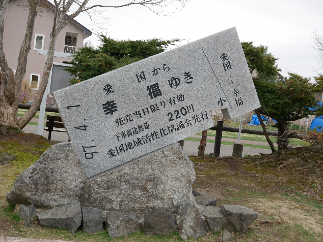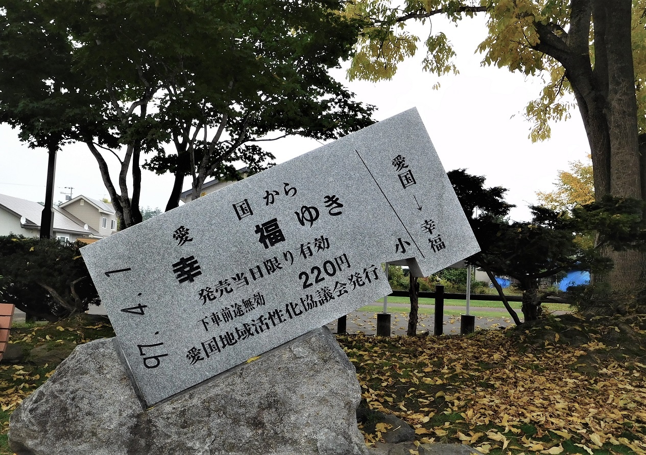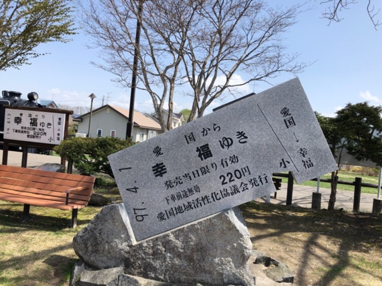 1970年代にブームになった、愛国駅→幸福駅ゆきのきっぷの形そのままの石碑がありました! 写真撮影スポットとしても空いてるので良いかも。