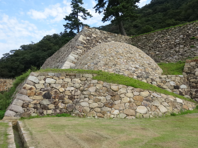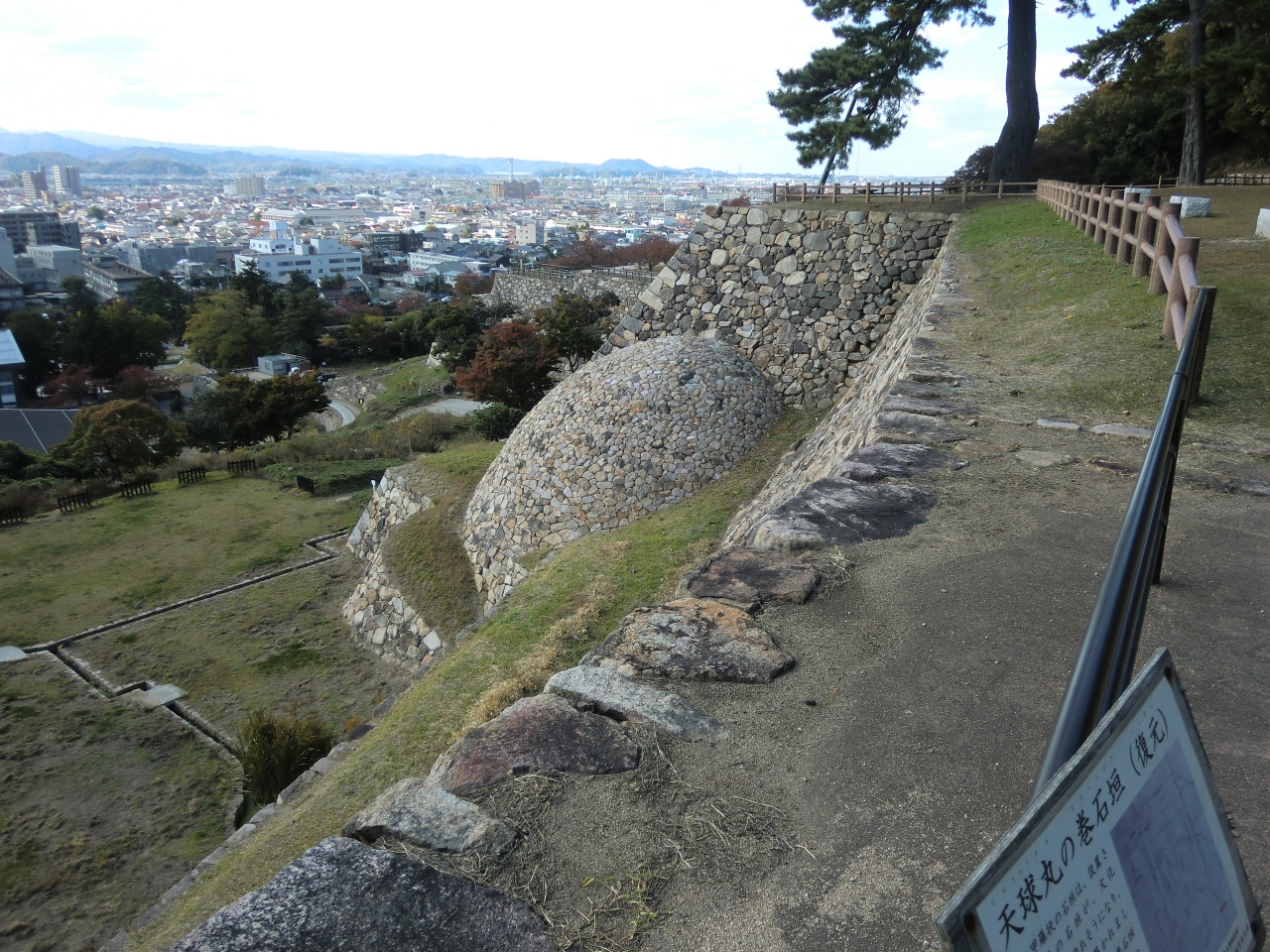 久松山の山麓には二の丸、三の丸、天球丸があります。三の丸は高校が、二の丸の麓の扇御殿跡は明治時代に建てられた仁風閣があります。石垣の修復がところどころ行われています。山麓部分はすぐ見終わると思ってましたが、敷地は予想以上に大きいです。天球丸は、必見ですね。丸い石垣は国内唯一とのことです。