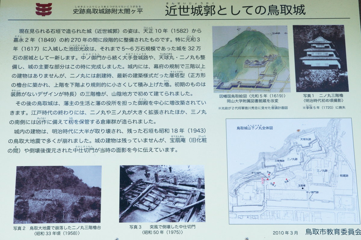 豊臣秀吉の兵糧攻めで有名な鳥取城の跡地の一部。市内を一望できる「山上の丸」までは約40分。桜の名所百選にも選ばれて、春には約230本の桜が咲き誇る。内濠に沿って松・梅・ツツジ・桜が植えられている。フレンチ・ルネッサンス様式の白亜の洋館「仁風閣」は国指定重要文化財。
