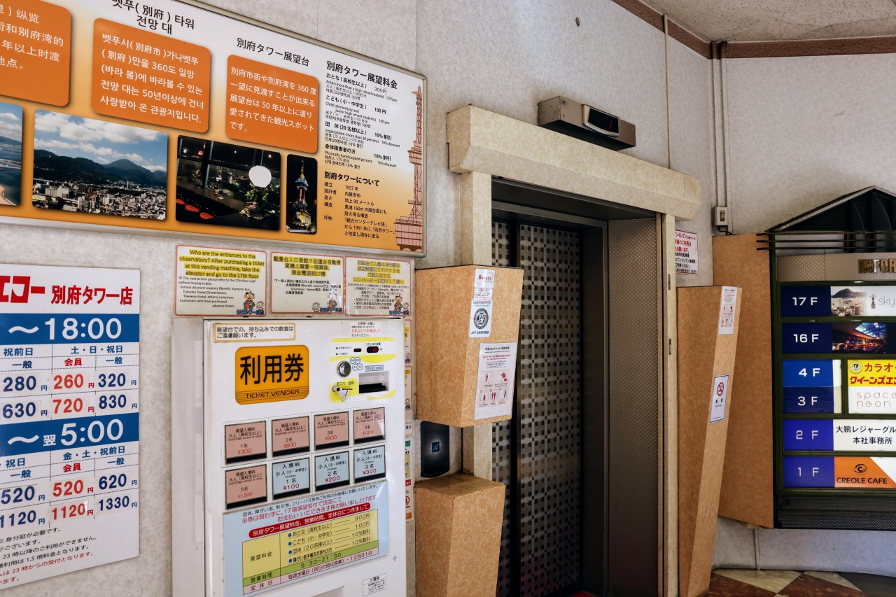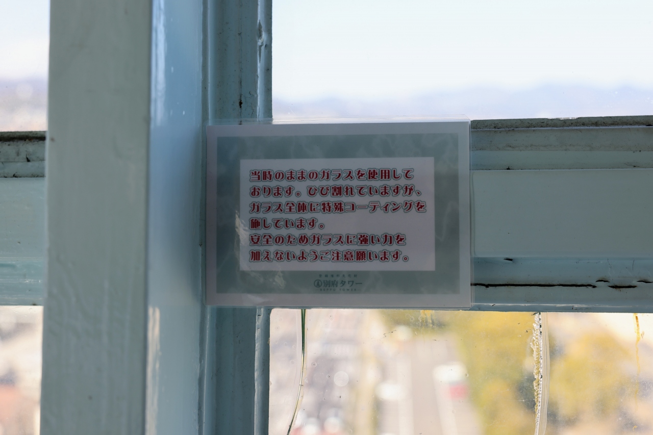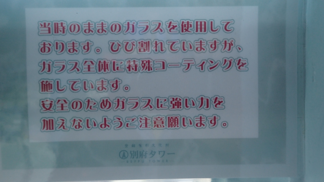 大分空港から車で1時間、別府から大分に向かう国道10号沿いに「別府タワー」があります。タワー好きとしては押さえなくてはいけ... 続きを読むない場所ですので、しっかり見学してきました。駐車場は近くのコインパーキングを利用、隣のセブンイレブンに止める人もいるらしいのですがルールを守りましょう。国道側にある入口にいきなり券売機があります。大人300円・小人100円、チケットを買ってその隣にあるエレベーターのボタンを押します。案内係などはいません。エレベーターに乗ったら自分で17階を押します。エレベータに窓などは無く・・・1分程度で17階に到着し扉が開きます。そこには受付があり、入口で購入した入場券を渡して展望室に入り別府市内を眺めます。外を見ようとすると・・・窓ガラスが割れています・・・そこに注意書きが「当時のままのガラスを使用しております。ひび割れしていますがガラス全体にコーティングを施しています。安全のためガラスに強い力を加えないようご注意願います」とのこと。立ってから60年以上たっていますので、それだけで貴重ですね。展望室の高さ55mと、タワーというには微妙ですが、その形、存在感は凄いです。建築構造家・内藤多仲氏の設計によるタワー六兄弟(名古屋テレビ塔、通天閣、さっぽろテレビ塔、東京タワー、博多ポートタワー)、今回の別府タワーでコンプリートです! 閉じる