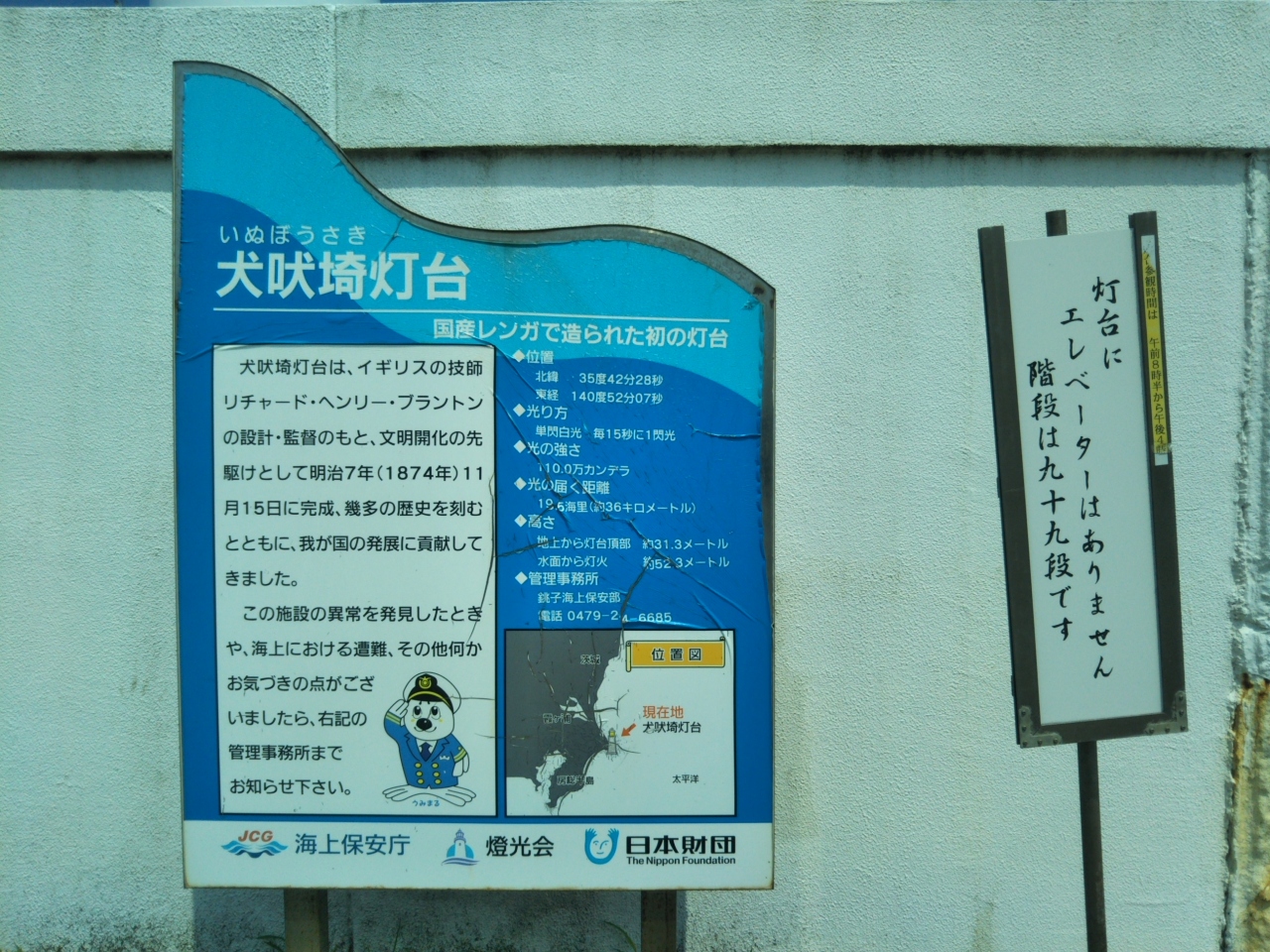 犬吠埼灯台は、銚子半島の最東端、太平洋に突き出た岬にあります。三方を海に囲まれた高さ約20mの海食台地の突端、海抜52mの白亜の灯台です。犬吠埼の探勝の中心地にあります。光遠距離19.5海里、15秒ごとに1閃光を放って露信号、無線方位信号も放つことができます。慶応2年(1866年)日本、イギリス、フランス、アメリカ、オランダの間に結ばれた条約に基づいて建造され、設計はイギリス人技師ブラントンで初めて日本製のレンガを使用した灯台です。