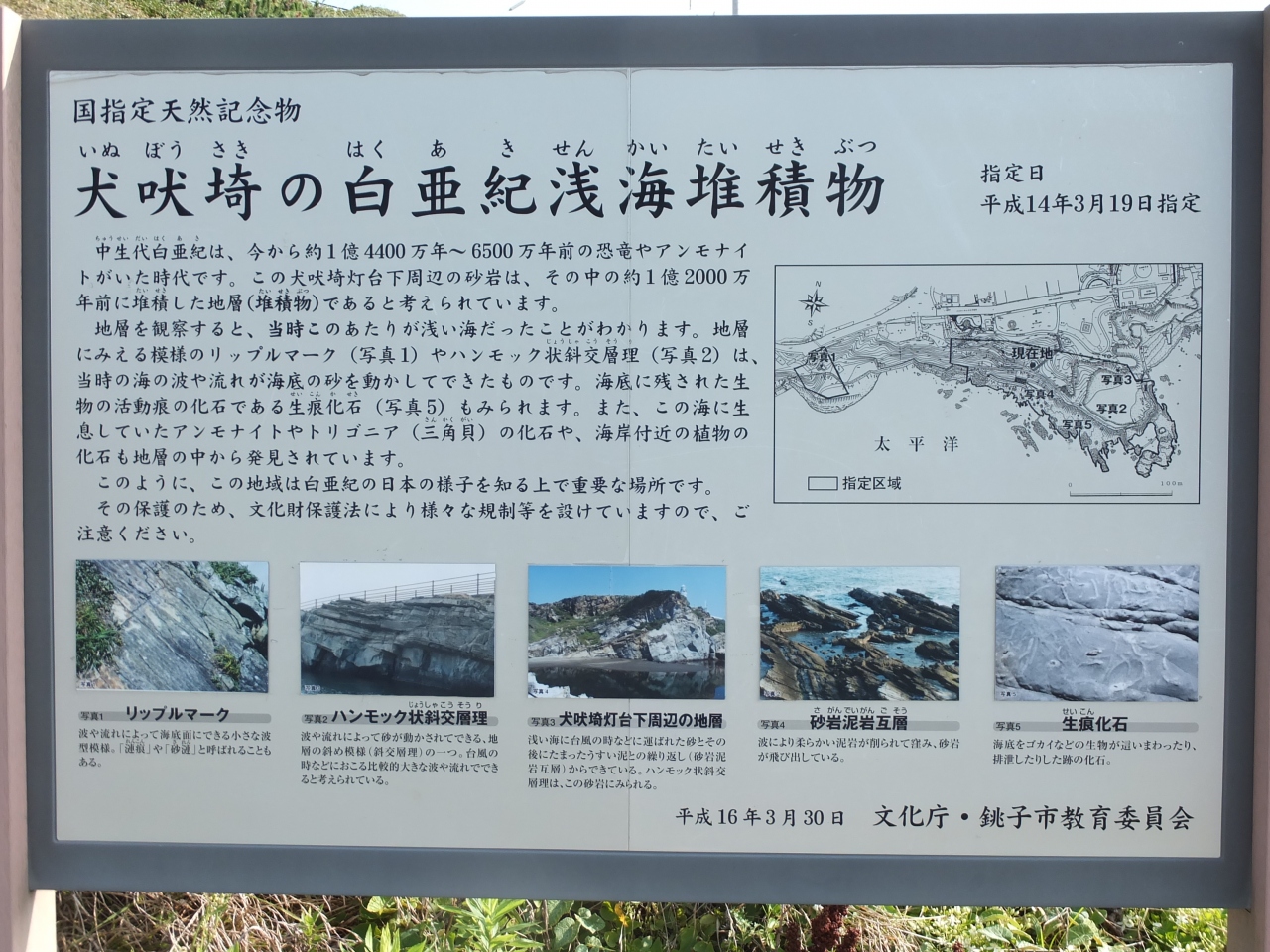犬吠埼灯台は、銚子半島の最東端、太平洋に突き出た岬にあります。三方を海に囲まれた高さ約20mの海食台地の突端、海抜52mの白亜の灯台です。犬吠埼の探勝の中心地にあります。光遠距離19.5海里、15秒ごとに1閃光を放って露信号、無線方位信号も放つことができます。慶応2年(1866年)日本、イギリス、フランス、アメリカ、オランダの間に結ばれた条約に基づいて建造され、設計はイギリス人技師ブラントンで初めて日本製のレンガを使用した灯台です。