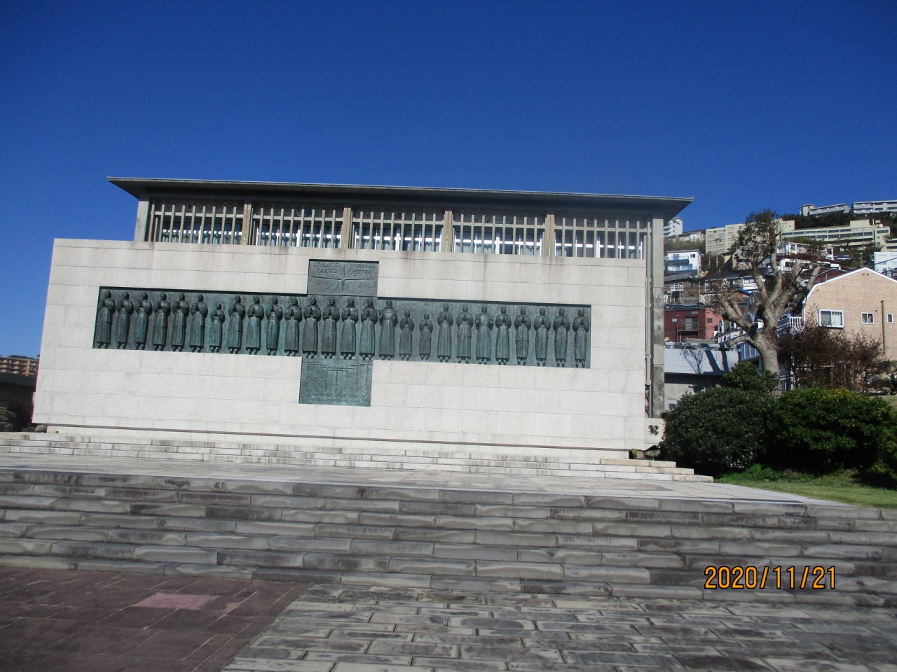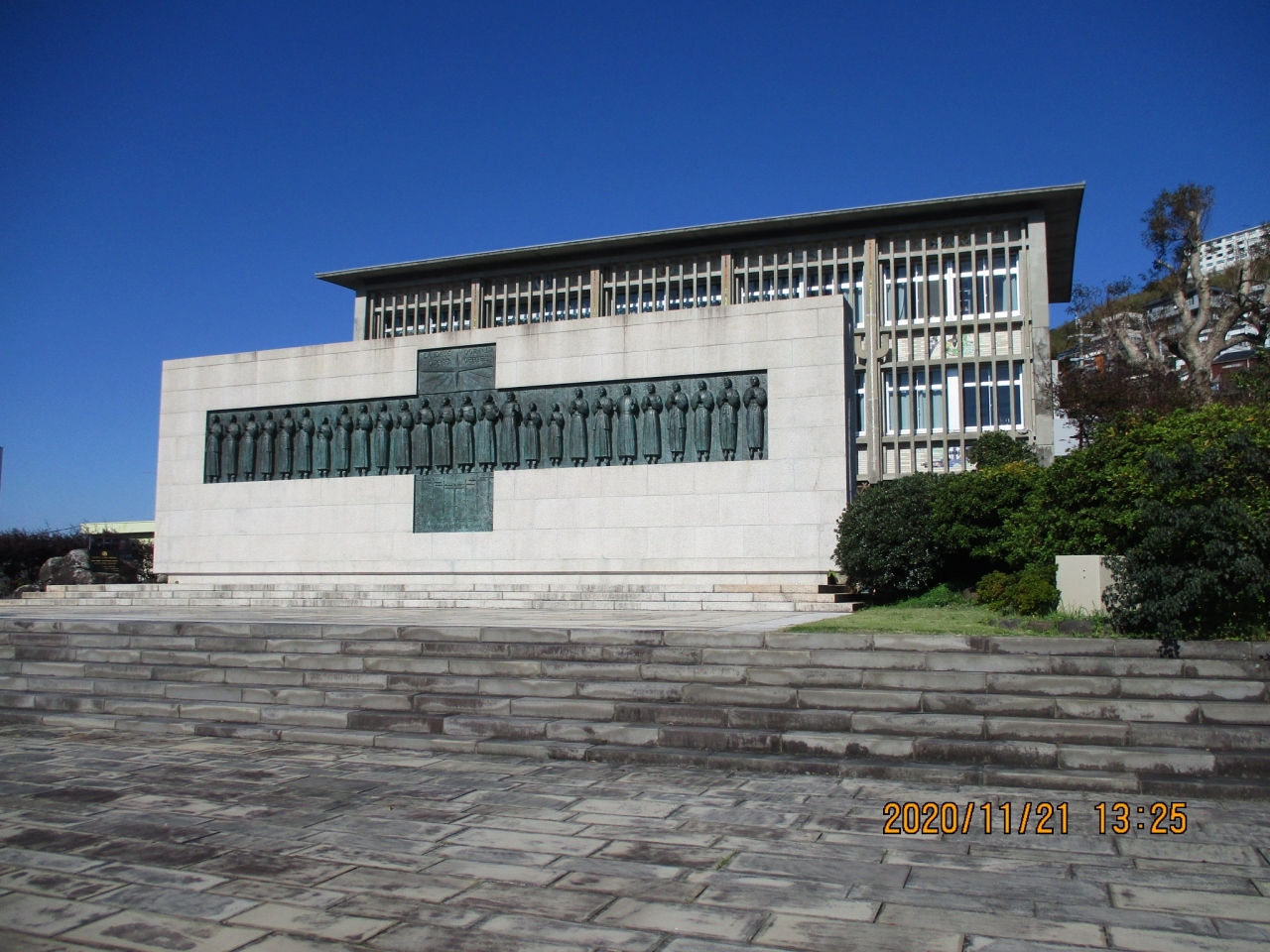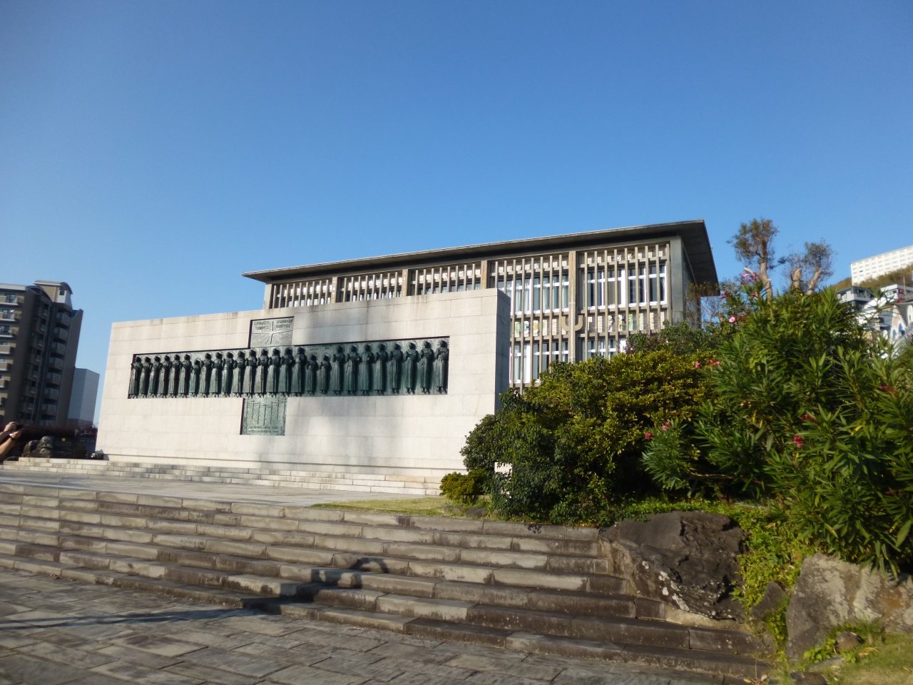 長崎県長崎市西坂町にある「日本二十六聖人殉教記念碑」と「日本二十六聖人記念館」についての情報を発信していきます。今回、「日... 続きを読む本二十六聖人殉教記念碑」と「日本二十六聖人記念館」を訪れたのは2024年月日です。 最終の目的地である「日本二十六聖人殉教記念碑」、「日本二十六聖人記念館」へ「大浦天主堂」前からタクシーで向かいました。「日本二十六聖人殉教記念碑」は、「JR長崎駅」東側にある「NHK長崎放送局」横の坂道を180mほど上ると左手に小高い丘があります。そして、「西坂公園」の出入口がそこにあり、そこから入ると「日本二十六聖人殉教記念碑」が正面に見えてきます。「日本二十六聖人記念館」は、「日本二十六聖人殉教記念碑」裏側にあります。「西坂公園」の小高い丘で、慶長2年(1597)年2月5日に京阪地方へ伝導していたフランシスコ会宣教師6人と日本人信徒20人が処刑されました。ちなみに、「豊臣秀吉」の命によって、京都と大阪で捕らえられ歩いて長崎まで護送されたフランシスコ会の宣教師6人、イエズス会のパウロ三木ら3人、信徒17人が磔形に処せられたそうです。よく「日本二十六聖人殉教記念碑」を見ると3人の子供も見受けられました。なんと痛ましいことですね。この「日本二十六聖人殉教記念碑」は、岩手県出身の彫刻家「舟越保武」が制作した二十六聖人のブロンズ像が花崗岩の台座に設置されものです。そして、ブロンズの十字架の縦木の部分に、詩編117とマルコ福音書8章34節が刻まれています。長崎県は昭和31年(1956年) 4月6日に史跡に指定しました。「日本二十六聖人記念館」は、昭和37年(1962)に建築家の「今井兼次」の設計に建設されました。「日本二十六聖人記念館」では、「聖フランシスコ・ザビエル」の渡来から明治時代までの日本のキリスト教の歴史、日本と南ヨーロッパとの出会いから生まれたキリシタン文化、二十六聖人をはじめとした殉教者のメッセージを紹介しています。『聖フランシスコ・ザビエル全書簡』や、踏み絵と同型の16世紀の「ピエタ」、潜伏キリシタンゆかりの絵画「雪のサンタ・マリア」やステンドグラスなどの貴重な展示資料と約3,000冊の専門図書があり、2階には建築家の「今井兼次」が手がけた特別展示室「栄光の間」があります。私も入ってみましたが、すごく厳かで神聖な雰囲気に包まれている場所でした。私も日本の記念館等でこれだけのキリスト教関連の施設は初めての経験です。時間のないなか訪れて、貴重な体験ができ良かったと思いました。 01_【「日本二十六聖人殉教記念碑」と「日本二十六聖人記念館」の一口メモ】 ⑴ 所在地 ①「日本二十六聖人殉教記念碑」…〒850-0051 長崎県長崎市西坂町4 西坂公園 ②「日本二十六聖人記念館」…〒850-0051 長崎県長崎市西坂町7-8 電話:095-822-6000 ア 営業時間…9:00~17:00 イ 入館料…大人500円、中・高校生300円、小学生150円 ウ 休日…12月31日~1月2日 02_【「日本二十六聖人殉教記念碑」と「日本二十六聖人記念館」へのアクセス】 「JR長崎駅」東口から徒歩8分150mほど 03_【「日本二十六聖人殉教記念碑」の名簿】 殉教者の順序は慶長2年(1597年)の「ルイス・フロイス」 の記録によるそうです。レリーフも、この順序に従い、殉教者は、右から左へ並んでいます。 ①聖フランシスコ ②聖コスメ竹屋 ③聖ペトロ助四郎 ④聖ミカエル小崎 ⑤聖ディエゴ喜斉 ⑥聖パウロ三木 ⑦聖パウロ茨木 ⑧聖ヨハネ五島 ⑨聖ルドビコ茨木 ⑩聖アントニオ ⑪聖ペトロ・バプチスタ ⑫聖マルチノ・デ・ラ・アセンシオン(スペイン) ⑬聖フィリッポ・デ・ヘスス(メキシコ) ⑭聖ゴンザロ・ガルシア(インド) ⑮聖フランシスコ・ブランコ(スペイン) ⑯聖フランシスコ・デ・サン・ミゲル(スペイ ン) ⑰聖マチアス ⑱聖レオン烏丸 ⑲聖ボナベントウラ ⑳聖トマス小崎 ㉑聖ヨアキム榊原 ㉒聖フランシスコ医師 ㉓聖トマス談義者 ㉔聖ヨハネ絹屋 ㉕聖ガブリエル ㉖聖パウロ鈴木 閉じる