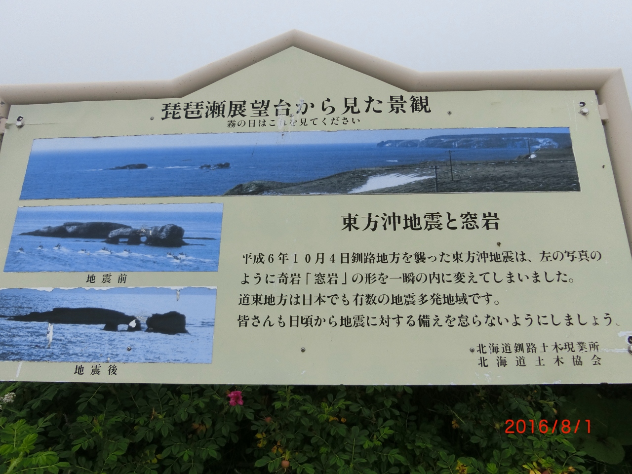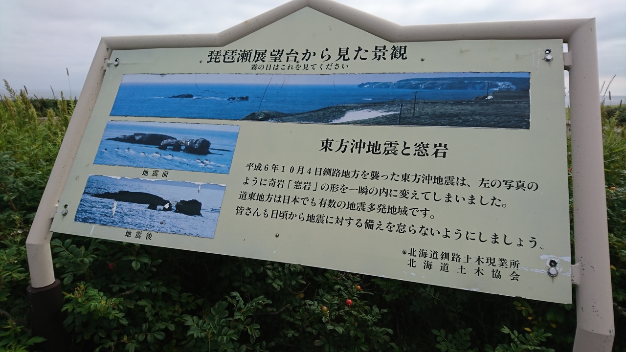 霧多布湿原の南に位置する高台にあり、360度の視界が楽しめます。 前方を見ると広大な霧多布湿原の中を琵琶瀬川が蛇行する大パノラマが展開、振り返ると大平洋の荒々しい景観が待ち受けており、国際級との観光評価もあります。 また、海岸側を見ると窓岩が望めます。この窓岩は、浜中町の奇岩のひとつ。 何年か前までは二つの窓がありメガネのような形をしていましたが、平成5年と6年の大きな地震により、片側が崩れてしまいました。