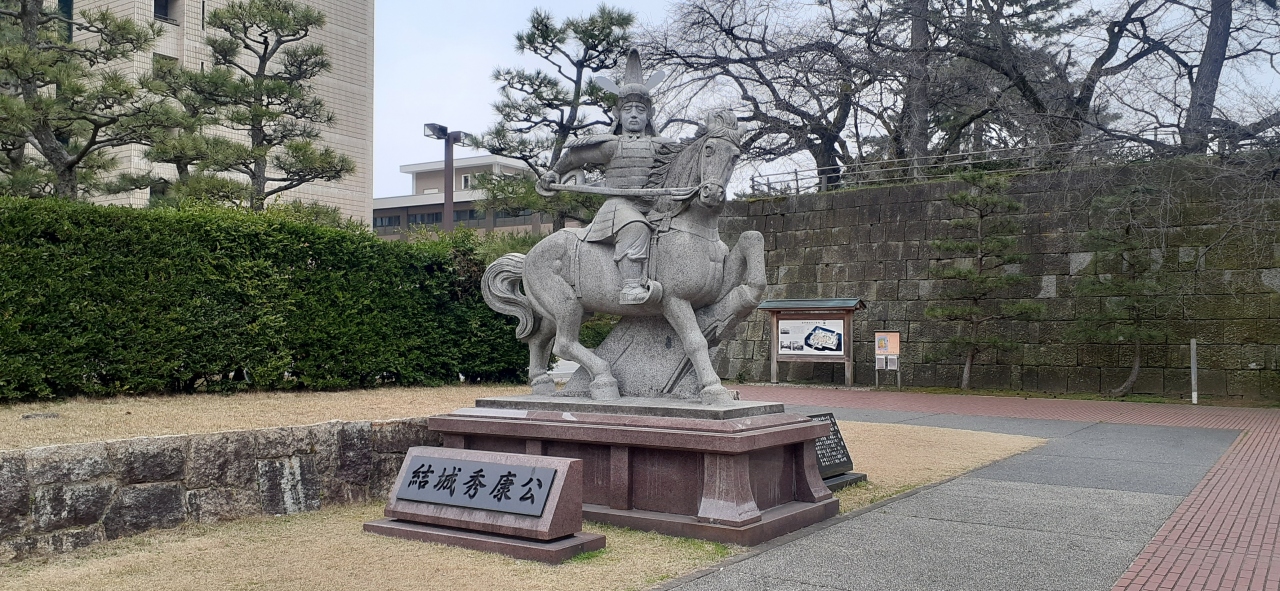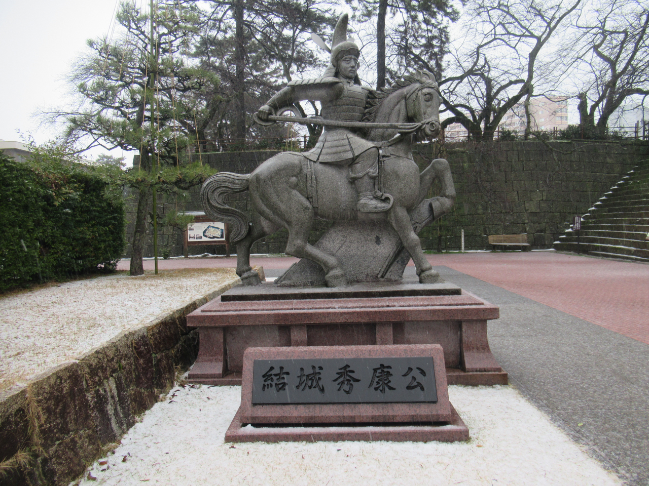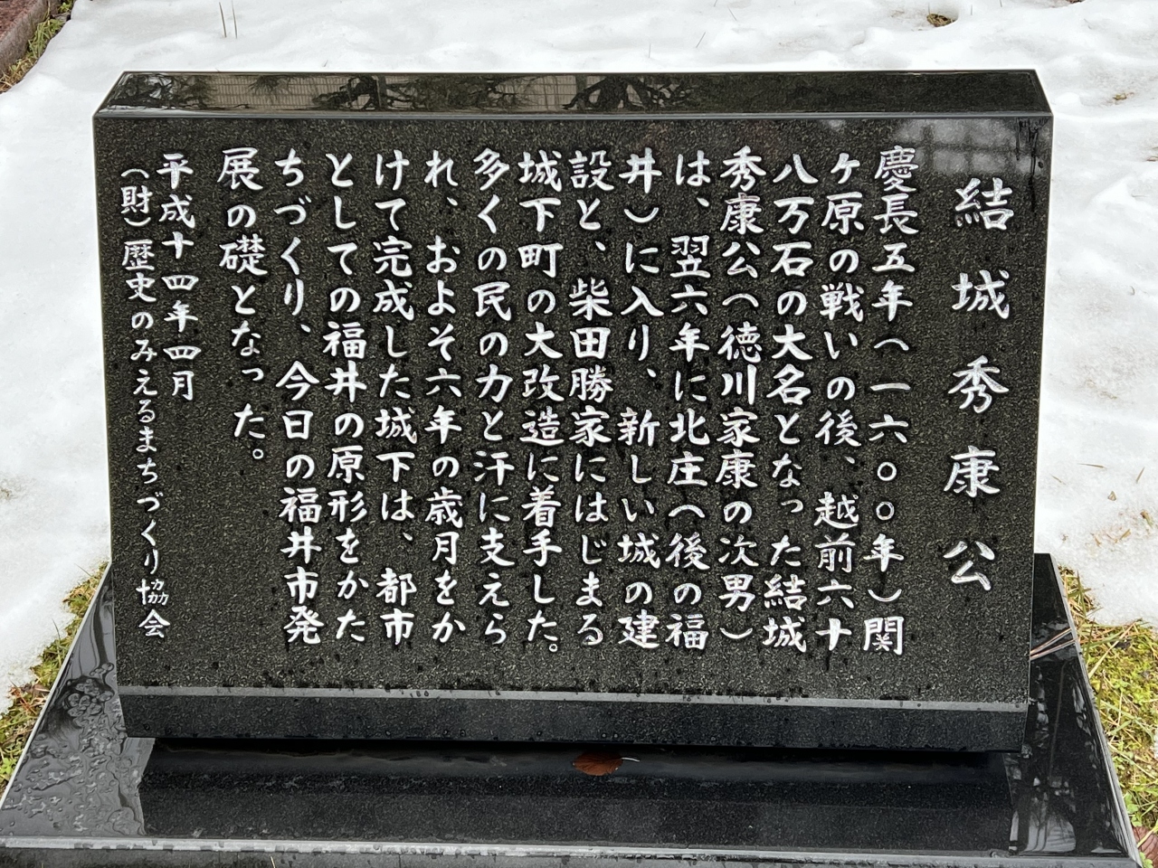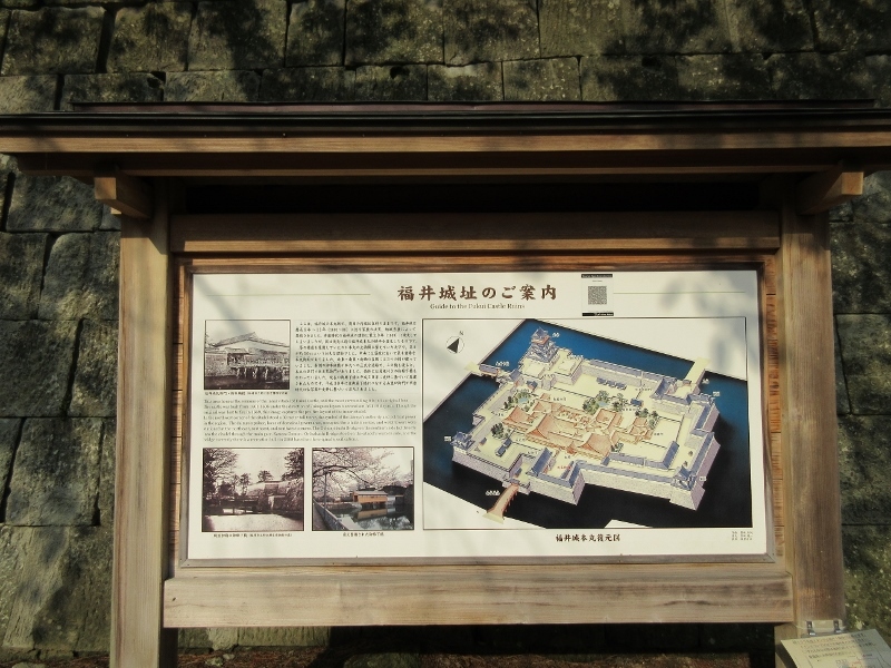 慶長9年(1600)の関ケ原の戦ののち、越前六十八万石を領して入封した結城秀康の築城になる。以来、徳川氏の親藩として秀康以降、越前松平氏代々の居城となり明治に至る(最後は三十二万石)。城は、北ノ庄城の北方600メートルの新北ノ庄に築かれた平城で、規模は姫路城に匹敵する偉容を誇ったと伝えるが、度重なる火災で天守をはじめ主要建造物を焼失した。現在は石垣と堀を残すのみで、本丸跡には県庁舎が建っている。◎結城秀康(1574-1607)浜名郡雄踏(宇布見)生れ。徳川家康二男。初代福井藩主。豊臣のち結城氏の養子となる。関ケ原の戦に宇都宮で在陣、上杉を抑えた功により越前に封ぜらる。◎松平忠直(1595-1650)大坂生れ。福井二代藩主。大坂夏の陣に越前藩兵を率いて参戦、大坂城一番乗りの功名をたてる。◎松平慶永(1828-90)江戸生れ。号春嶽。福井一六代藩主。政事総裁職となり、幕政改革・公武合体・雄藩連合政権樹立を目指し活動。王政復古後は、徳川宗家救済に大尽力。