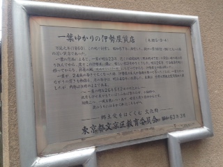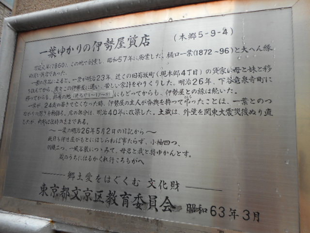 因みに、ここ旧伊勢屋質店は万延元年 (1860) この地に創業し、昭和57年 (1982) に廃業した樋口一葉 (1872~96) と大へん縁の深い質店で、土蔵は明治20年 (1887) に移築されたもの とのこと。