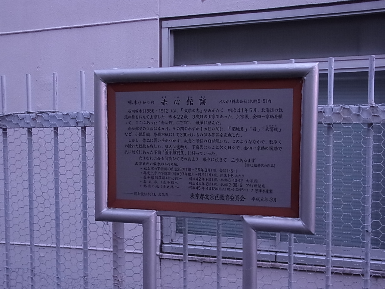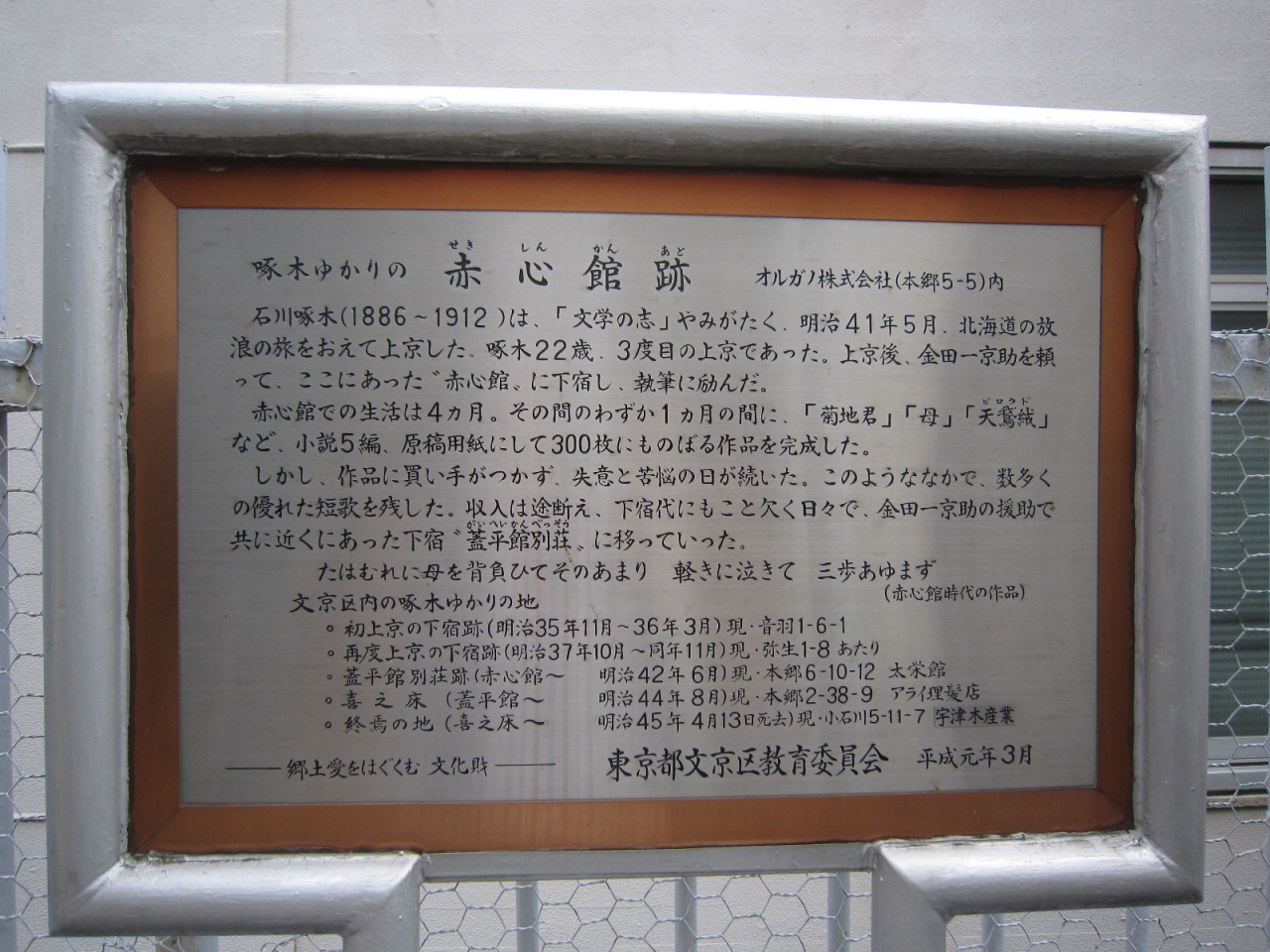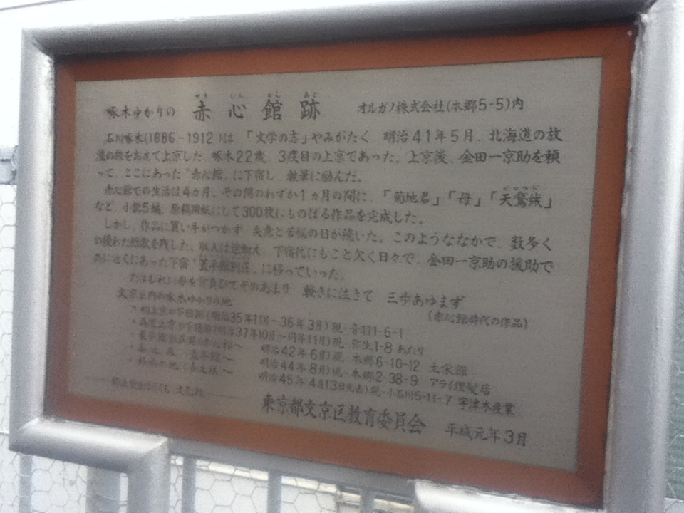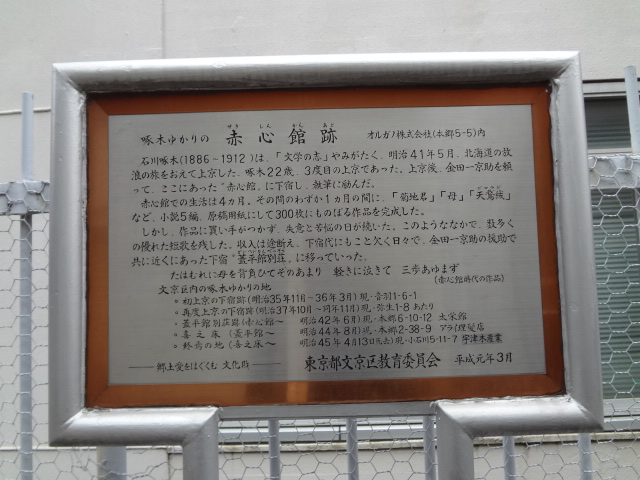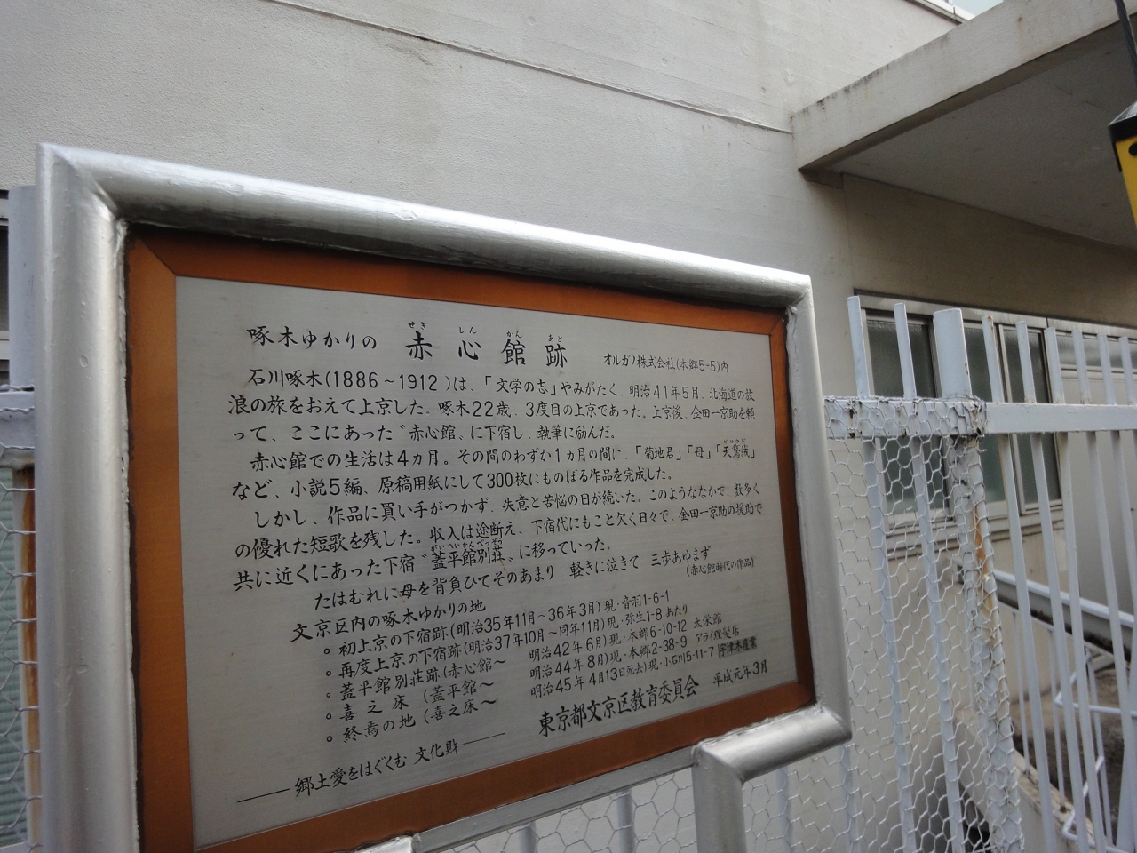 文京区本郷4丁目と5丁目の境界を通る菊坂界隈には文学関連のものが多く、その一つがここ「啄木ゆかりの 赤心館跡」です。
