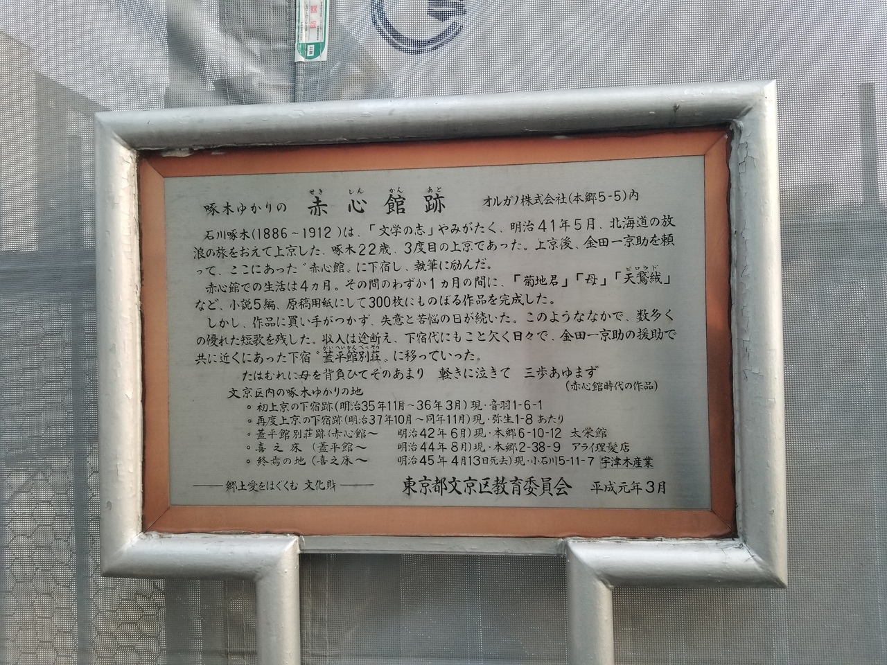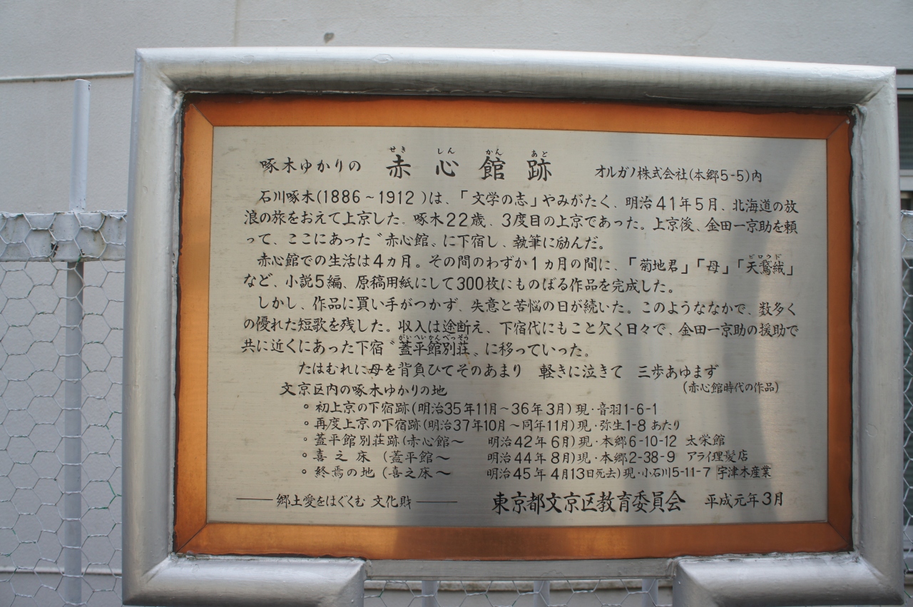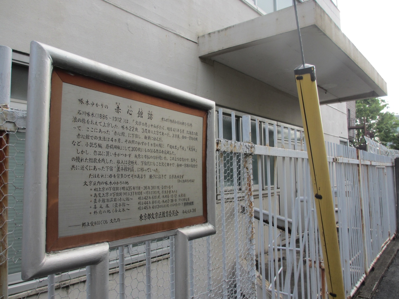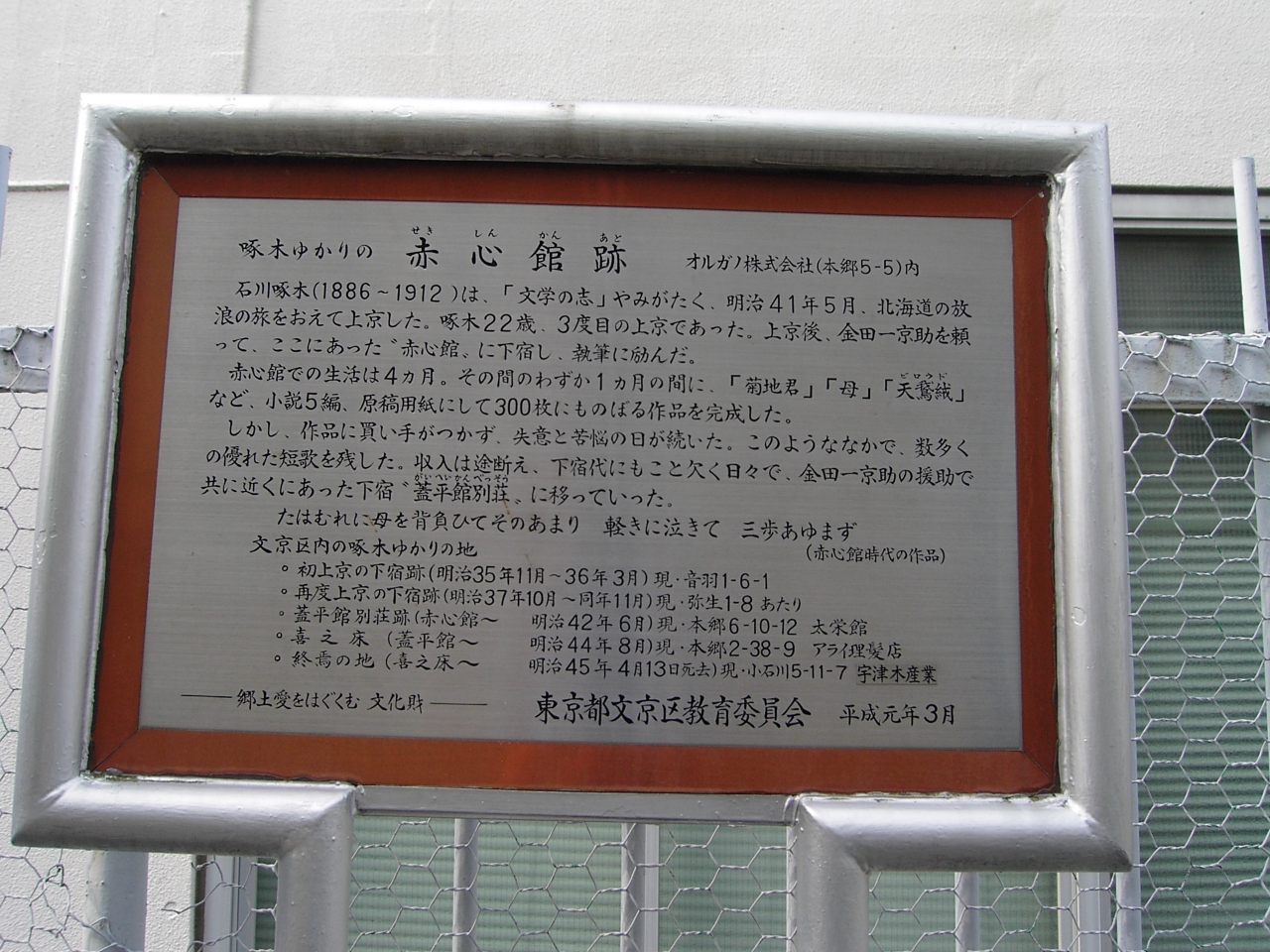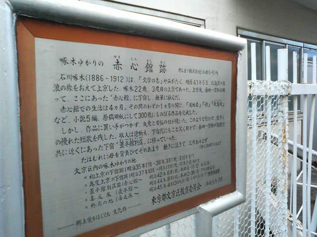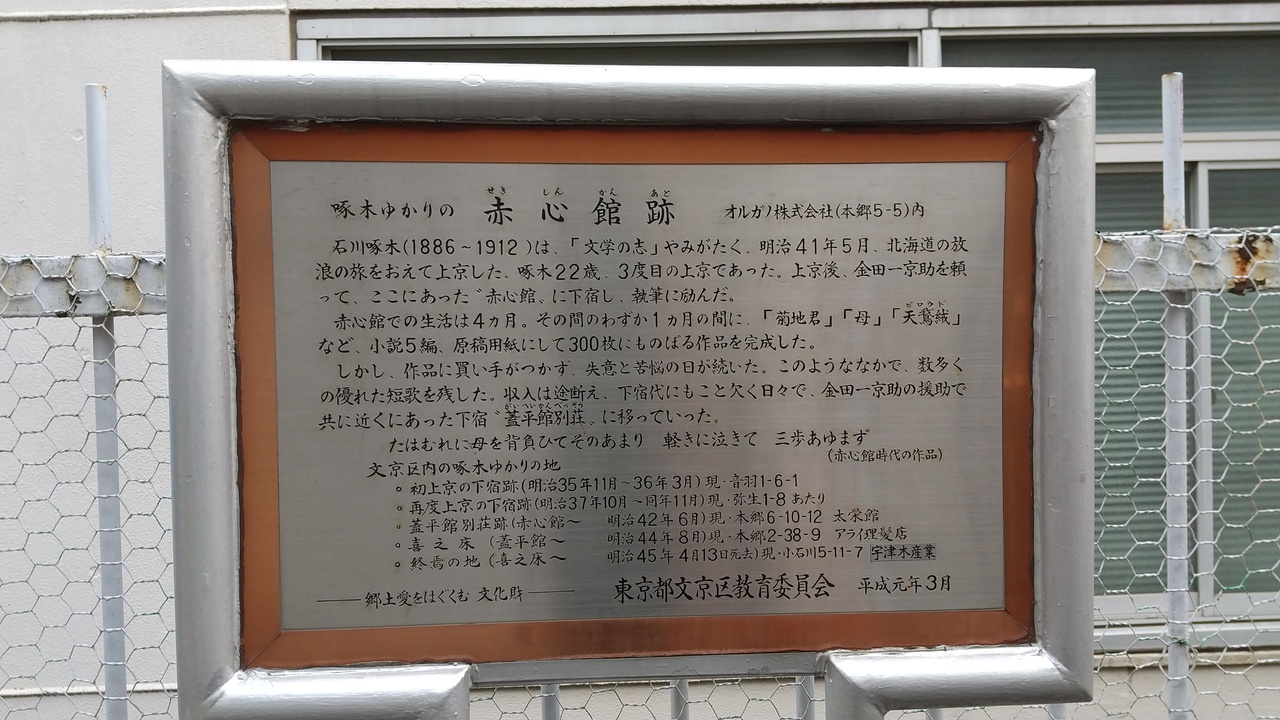 文京区本郷4丁目と5丁目の境界を通る菊坂界隈には文学関連のものが多く、その一つがここ「啄木ゆかりの 赤心館跡」です。