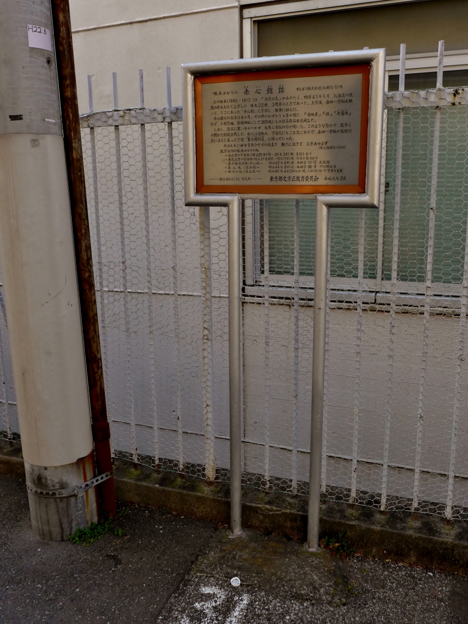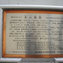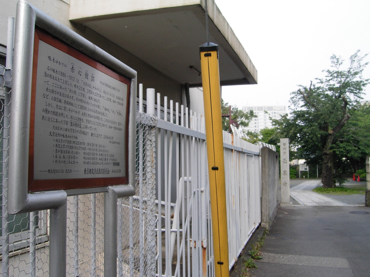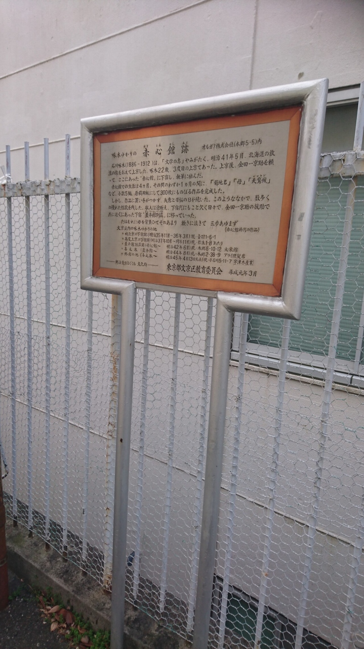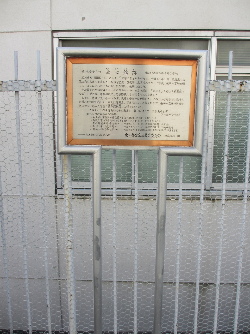 文京区本郷4丁目と5丁目の境界を通る菊坂界隈には文学関連のものが多く、その一つがここ「啄木ゆかりの 赤心館跡」です。