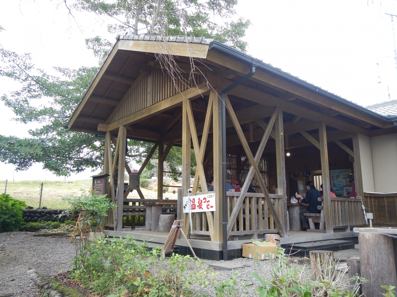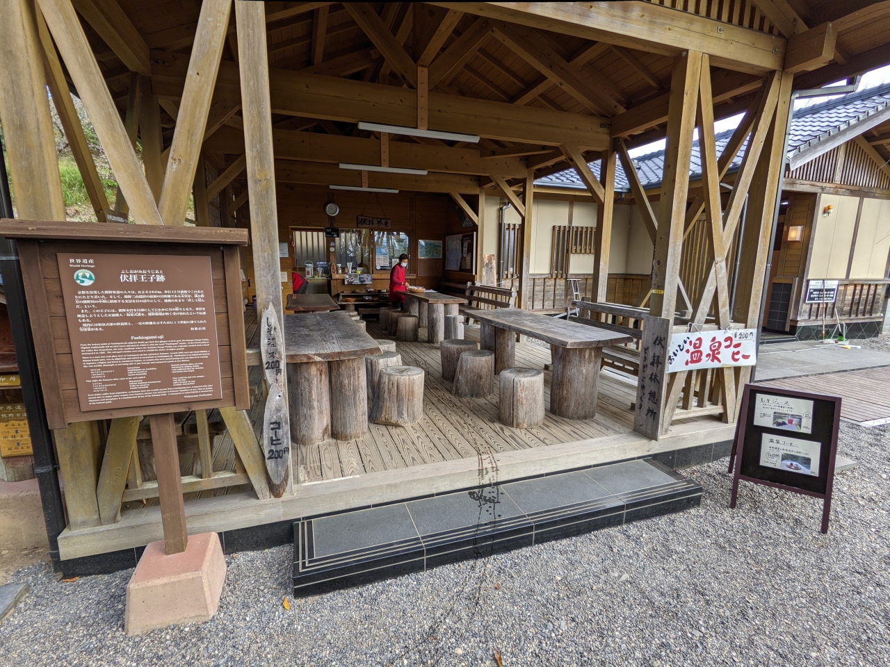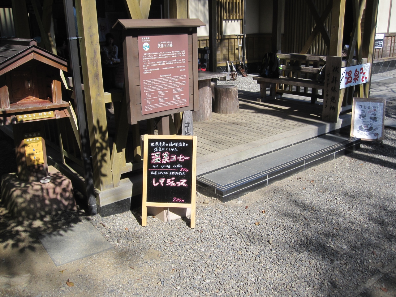 休憩所・トイレ・温泉コーヒー・記念スタンプがありました 実際の景色は熊野大社本宮を伏して拝むという感じはありませんでした