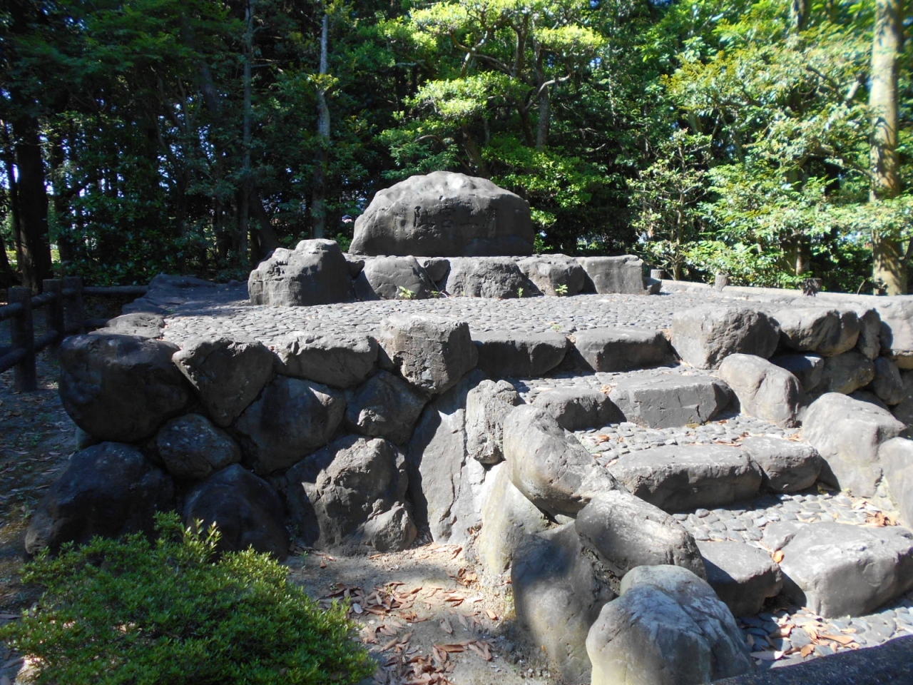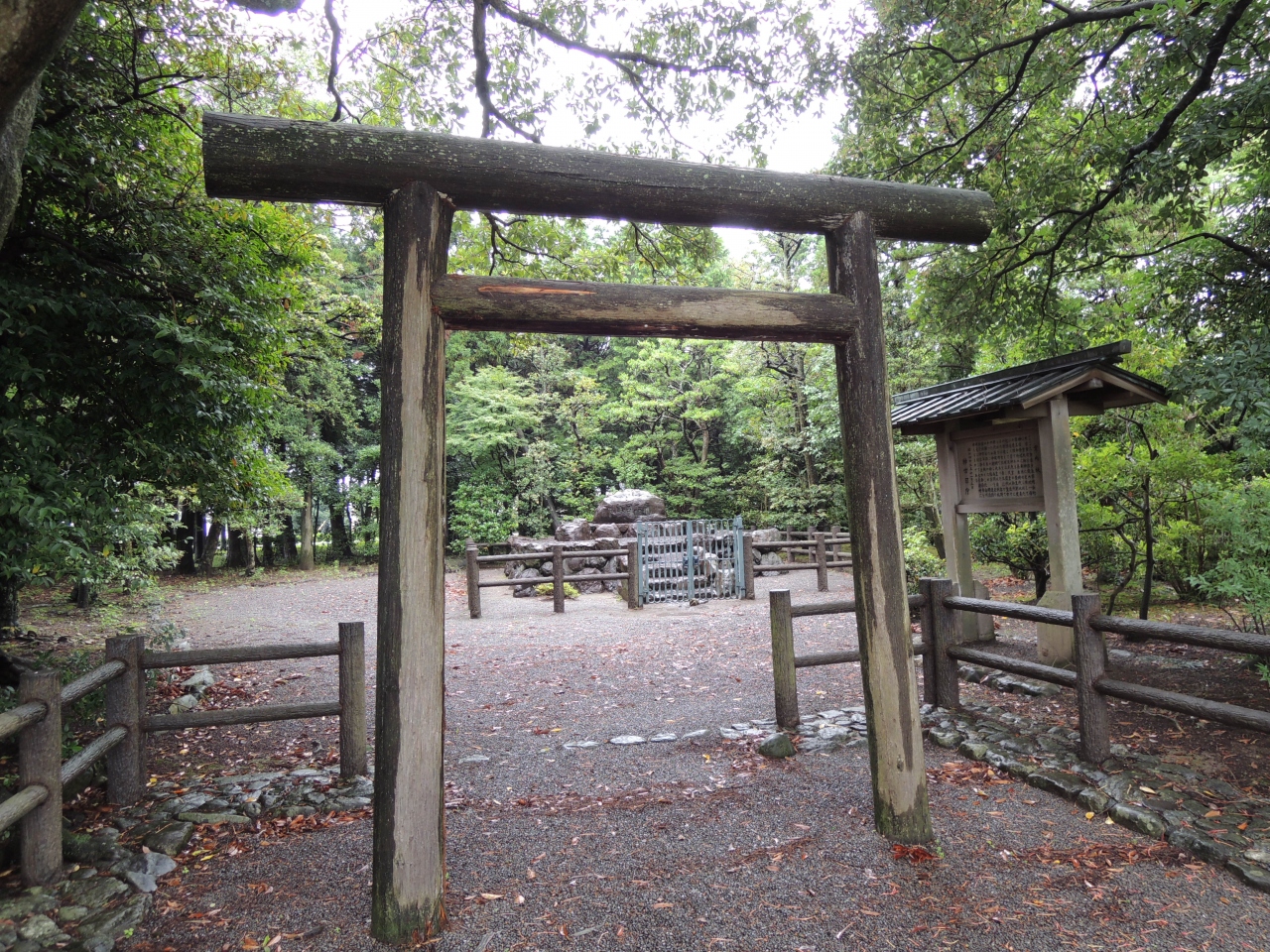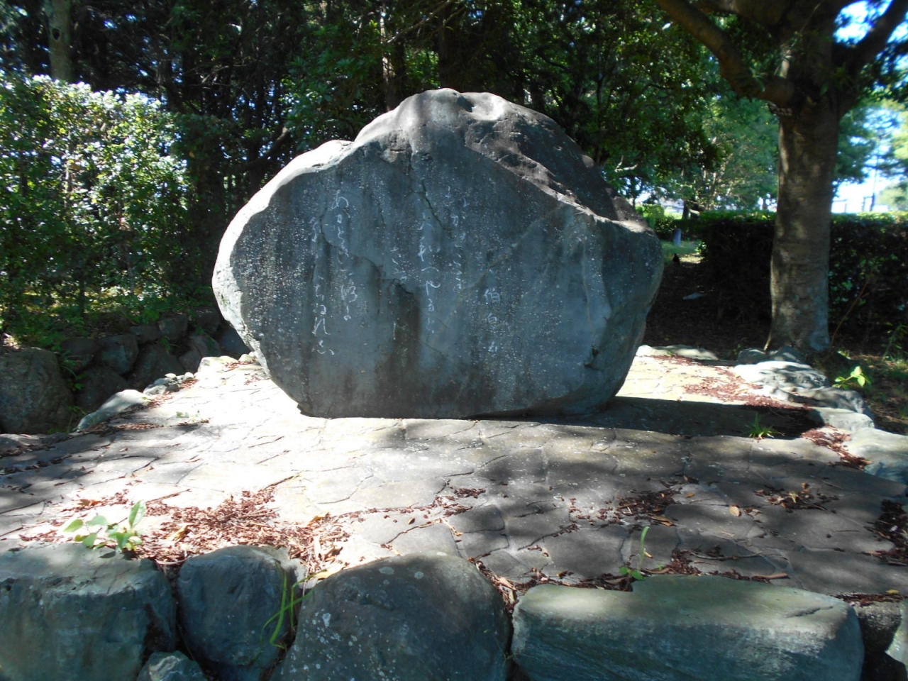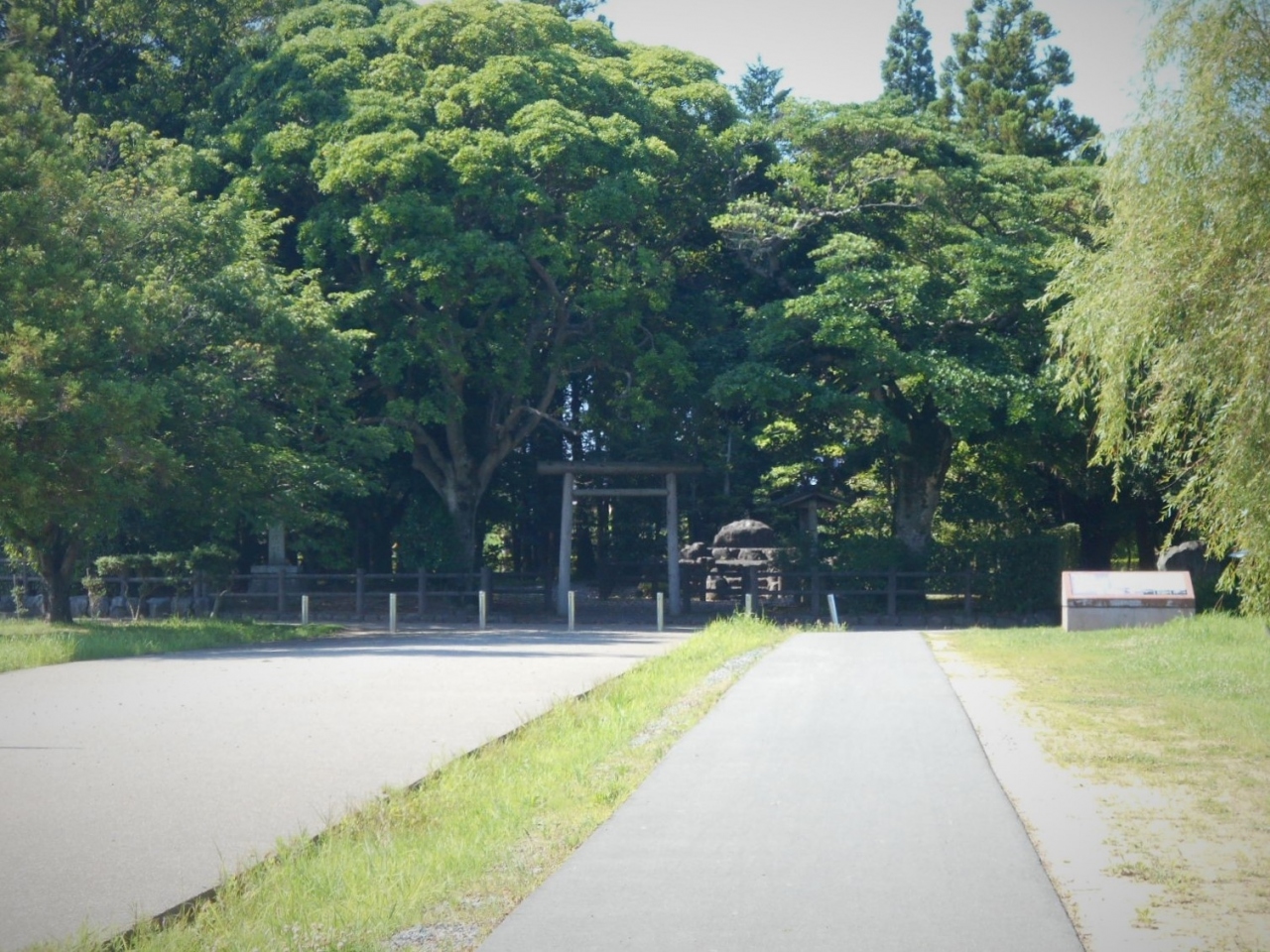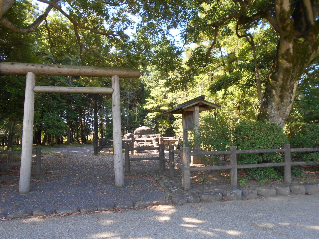 いつきのみや歴史体験館の北約200mに林があります。鳥居の奥に歌碑。万葉集の大来皇女の歌が刻まれています。