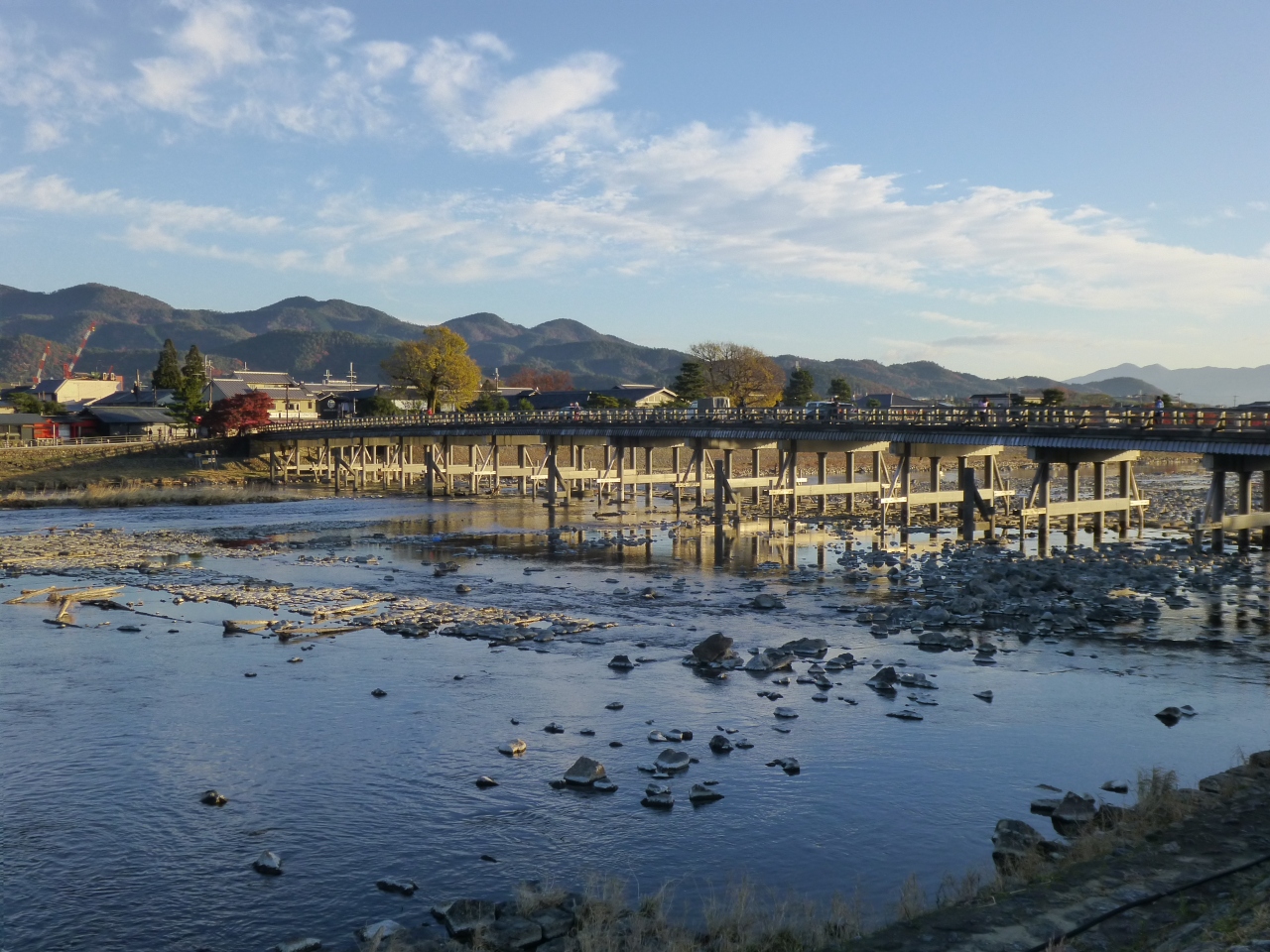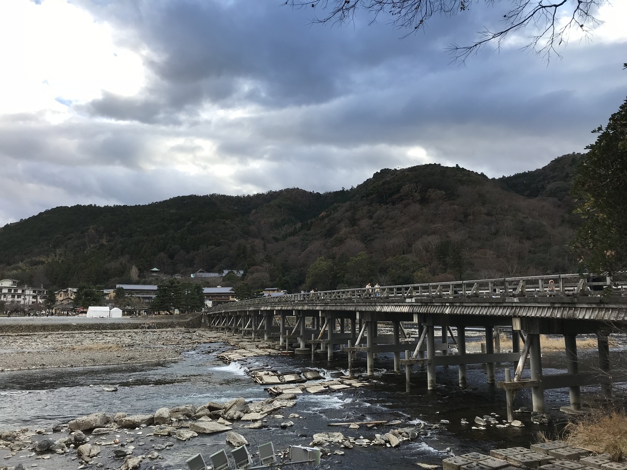 京都の観光名所として必ず出てくる渡月橋。京都には学生時代に住んだこともあるしその後も何度も観光に行ったこともあるのにまだ一... 続きを読む度も行ったことが無かったので今回初訪問。 紅葉や桜はないけれどTVや雑誌で見るのと同じ風情のある橋でした。 桂川に架かる橋かと思っていたら大堰川と書かれていたので、調べてみるとこの橋の上流を大堰川、下流を桂川という説やその他いろいろあって結局はっきりしません。1000年以上の歴史を持つ橋には色々な歴史が刻まれているのでしょう~ 閉じる