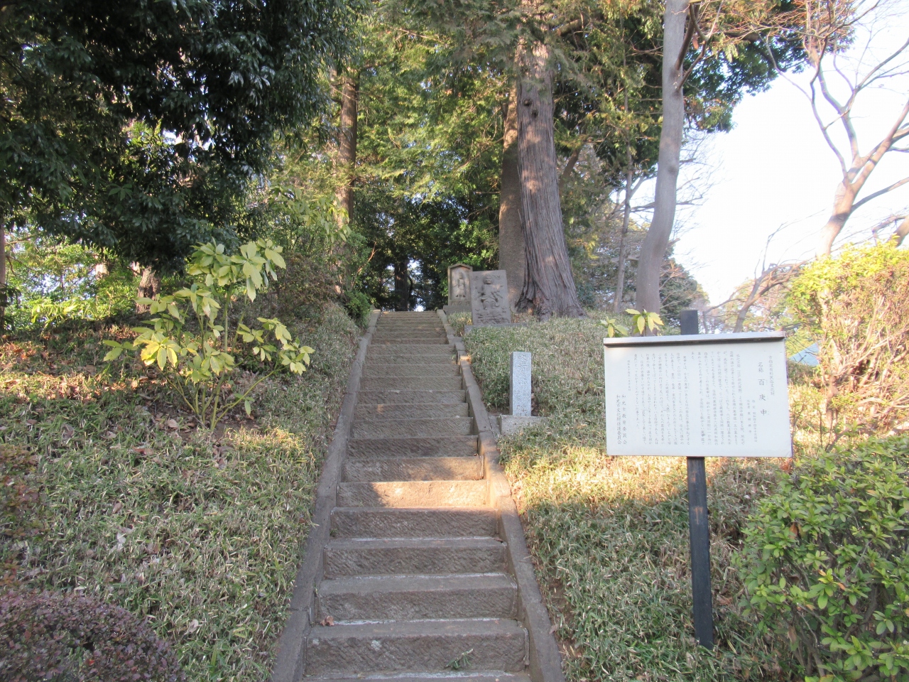 階段の登り口には、白色の庚申塔と解説板があり、階段の上部には、別の庚申塔と標識石が置かれています。