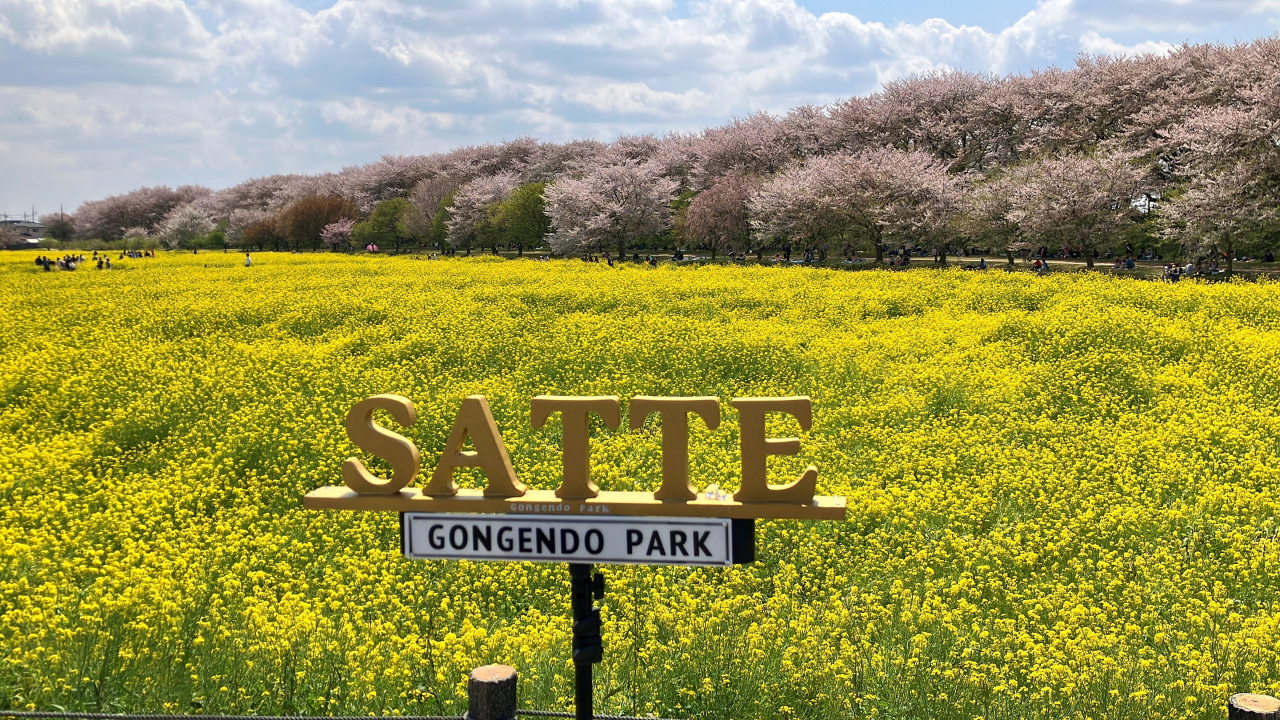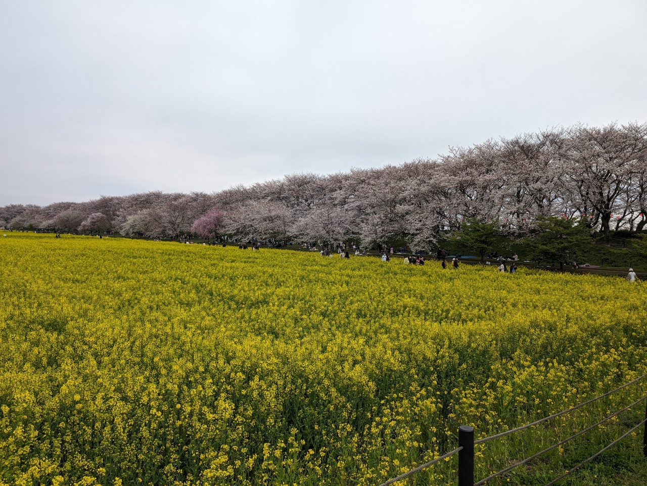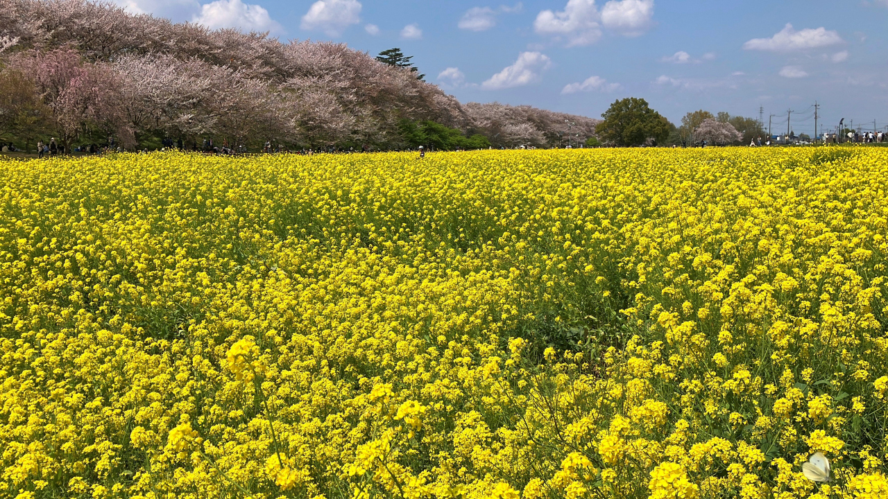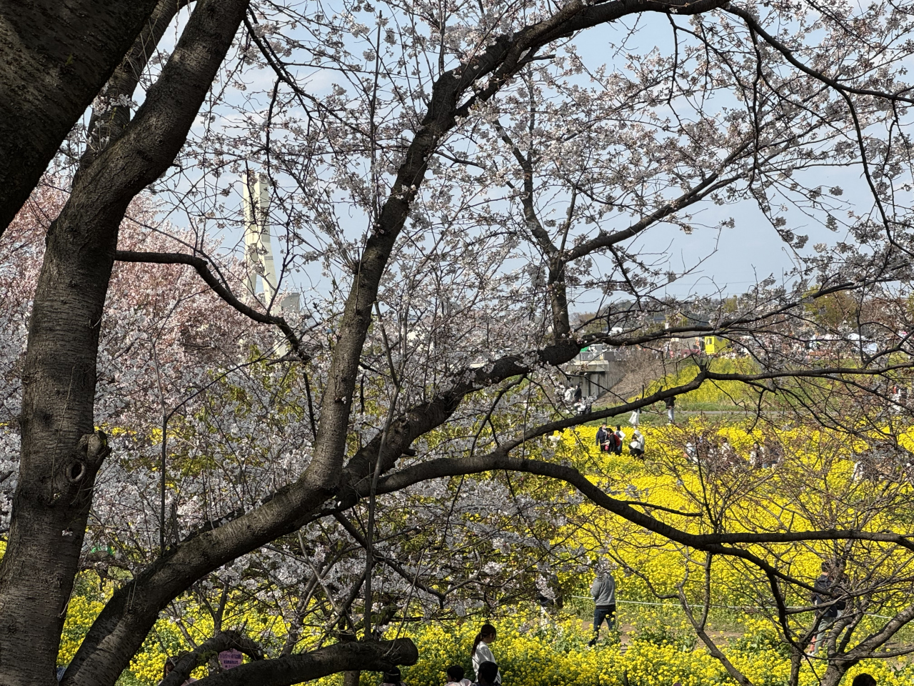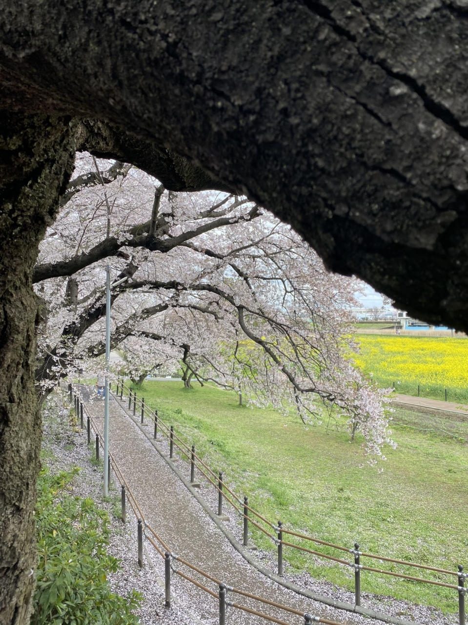権現堂桜堤では2023年は菜の花畑の中に通路を設けて、菜の花に埋もれながら桜を見ることができるようになりました。