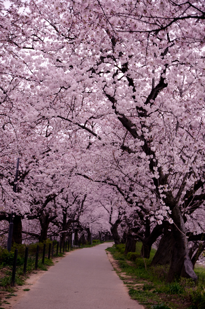 まっすぐな遊歩道なので、遠くの方は桜色に霞んで、目の前にはぼんやりとしたピンク色が広がります。